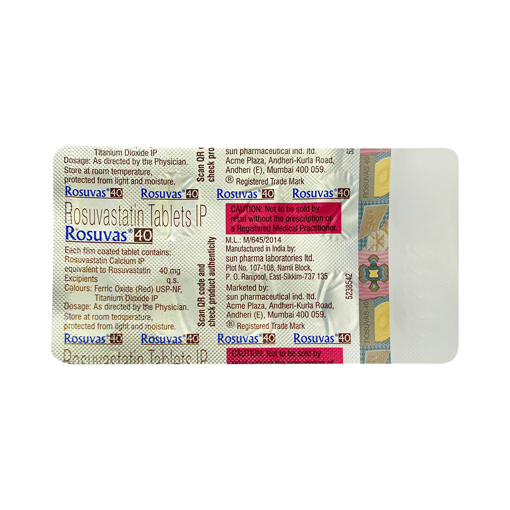 Rosuvas 40 Tablet belongs to a group of medicines called statins. It is used to lower cholesterol and triglyceride levels and reduce the risk of heart disease. Cholesterol is a fatty substance that builds up in your blood vessels and causes narrowing, which may lead to a heart attack or stroke. Rosuvas 40 Tablet is a widely prescribed medicine and is regarded as safe for long-term use. It can be taken with a meal or on an empty stomach. You can take it at any time of the day, but try to take it at the same time each day. Most people with high cholesterol do not feel ill. However, stopping your medicine may increase your cholesterol levels, making your condition worse and increasing your risk of heart disease and stroke.It is important to have your cholesterol levels checked regularly. This medicine is only one part of the treatment program, which should also include a healthy diet, regular exercise, smoking cessation, moderation of alcohol intake, and weight reduction. You can eat normally while taking this medicine, but try to avoid foods that are high in fat.Common side effects of this medicine include muscle pain, weakness, nausea, headache, and abdominal pain. These are usually mild and disappear after a short time. Consult your doctor if they persist or if you notice any yellowing of your eyes or get repeated or unexplained muscle pains.This medicine should not be used in conditions such as liver disease. Also, pregnant women and breastfeeding women should not take this medicine, as it may harm the developing baby. Diabetic patients should monitor their blood sugar levels while taking this medicine, as it may lead to an increase in blood sugar levels.