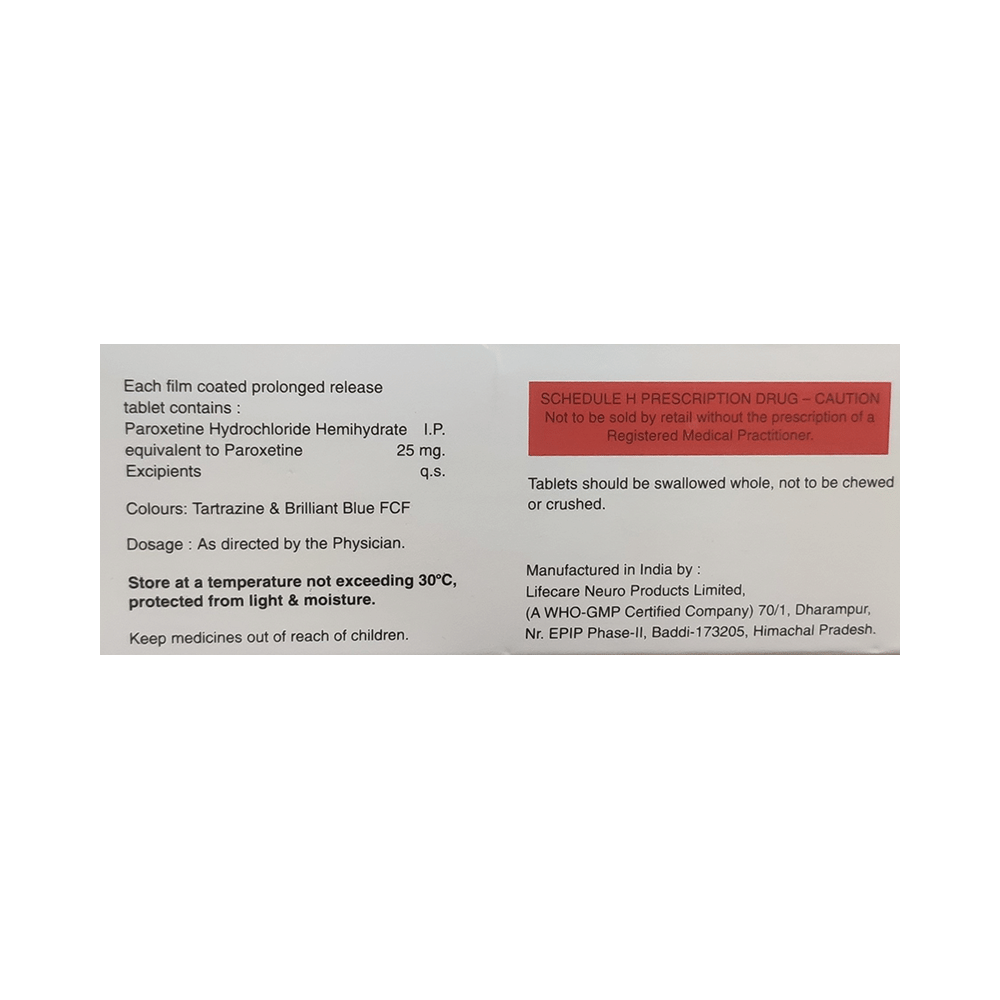 Roxient 25 Tablet PR is a type of antidepressant belonging to the selective serotonin reuptake inhibitor (SSRI) group of medicines. It is widely prescribed to treat depression and anxiety-related conditions like obsessive-compulsive disorder, and panic disorder. Roxient 25 Tablet PR helps many people to recover from depression by improving their mood and relieving anxiety and tension. It can be taken with or without food. The dose and how often you need it will be decided by your doctor so that you get the right amount to control your symptoms.Your doctor may start you on a lower dose and increase it gradually. Do not change the dose or stop taking it without talking to your doctor, even if you feel well. Doing so may make your condition worse or you may suffer from unpleasant withdrawal symptoms (anxiety, restlessness, palpitations, dizziness, sleep disturbances, etc).To get the most benefit, take this medicine regularly at the same time each day. Your doctor may advise you to take it in the morning if you have trouble sleeping. It may take a few weeks before you start feeling better. Let your doctor know if you do not see any improvement even after 4 weeks.Some common side effects of Roxient 25 Tablet PR include nausea, fatigue, dry mouth, loss of appetite, increased sweating, dizziness, nervousness, tremors, insomnia (difficulty in sleeping), and constipation. Sexual side effects like decreased sexual drive, delayed ejaculation, and erectile dysfunction may also be seen. Let your doctor know straight away if you develop any sudden worsening of mood or any thoughts about harming yourself.Before taking this medicine, you should tell your doctor if you have epilepsy (seizure disorder or fits), diabetes, liver or kidney disease, heart problems, or glaucoma. These may affect your treatment. Pregnant or breastfeeding women should also consult their doctor before taking it. Some other medicines may affect the way it works, especially other antidepressants and medicines called MAO inhibitors. Please tell your doctor about all the medicines you are taking to make sure you are safe.