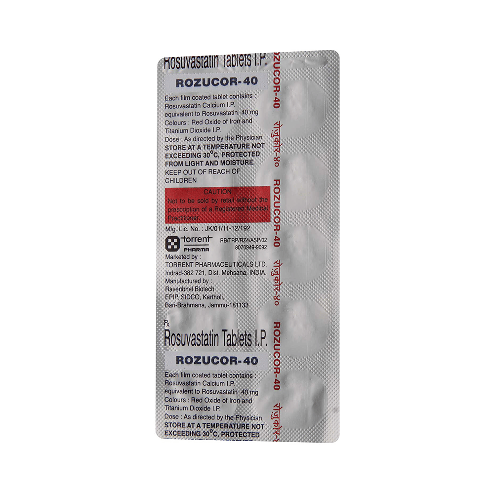 Rozucor 40 Tablet belongs to a group of medicines called statins. It is used to lower cholesterol and triglyceride levels and reduce the risk of heart disease. Cholesterol is a fatty substance that builds up in your blood vessels and causes narrowing, which may lead to a heart attack or stroke. Rozucor 40 Tablet is a widely prescribed medicine and is regarded as safe for long-term use. It can be taken with a meal or on an empty stomach. You can take it at any time of the day, but try to take it at the same time each day. Most people with high cholesterol do not feel ill. However, stopping your medicine may increase your cholesterol levels, making your condition worse and increasing your risk of heart disease and stroke.It is important to have your cholesterol levels checked regularly. This medicine is only one part of the treatment program, which should also include a healthy diet, regular exercise, smoking cessation, moderation of alcohol intake, and weight reduction. You can eat normally while taking this medicine, but try to avoid foods that are high in fat.Common side effects of this medicine include muscle pain, weakness, nausea, headache, and abdominal pain. These are usually mild and disappear after a short time. Consult your doctor if they persist or if you notice any yellowing of your eyes or get repeated or unexplained muscle pains.This medicine should not be used in conditions such as liver disease. Also, pregnant women and breastfeeding women should not take this medicine, as it may harm the developing baby. Diabetic patients should monitor their blood sugar levels while taking this medicine, as it may lead to an increase in blood sugar levels.