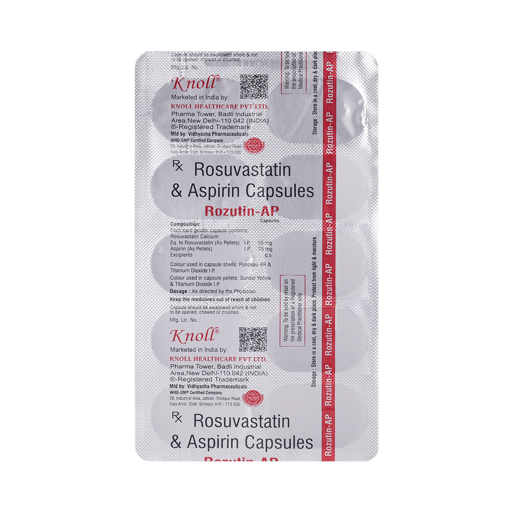 In Treatment of Prevention of heart attack and strokeRozutin AP 10mg/75mg Capsule is a combination medicine that is used to prevent heart attack. It contains rosuvastatin that works by reducing the amount of “bad” cholesterol (LDL) and raising the amount of “good” cholesterol (HDL) in blood. High levels of cholesterol can cause narrowing of the blood vessels (atherosclerosis). Lowering the amount of cholesterol reduces the chances of heart diseases and stroke and helps one remain healthier for longer. Rozutin AP 10mg/75mg Capsule also contains a blood thinner, aspirin, that prevents the formation of blood clots and the existing ones from growing bigger in size. Take it regularly and make appropriate lifestyle changes (such as eating healthy and staying active) to maximize the effectiveness of this medicine. Keep taking it even if you feel well.In Prevention of Angina (heart-related chest pain)Rozutin AP 10mg/75mg Capsule prevents the formation of blood clot. This makes blood flow more easily around your body and makes sure that your heart is getting a good supply of oxygen. Altogether, it reduces the risk of a chest pain caused by angina. This medicine might help increase your ability to exercise and go about your daily life more easily. You should take it regularly and as long as it is prescribed for it to work effectively.show moreshow less