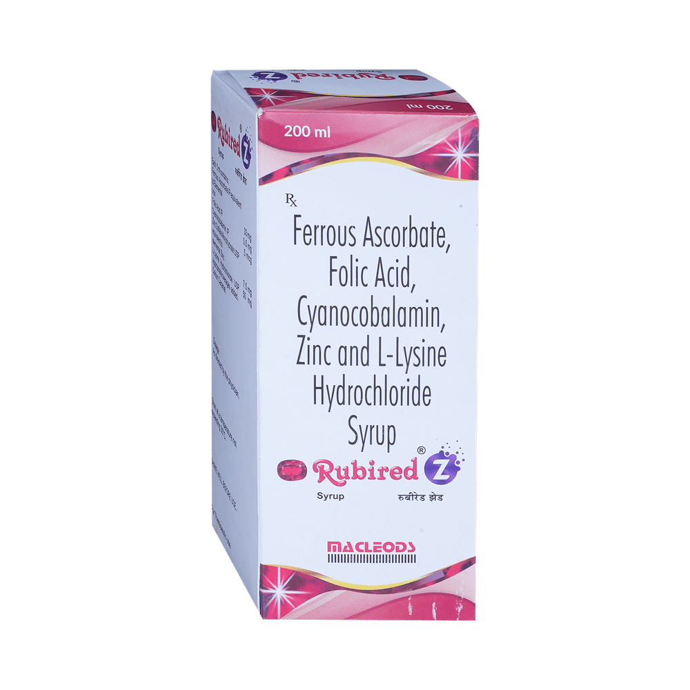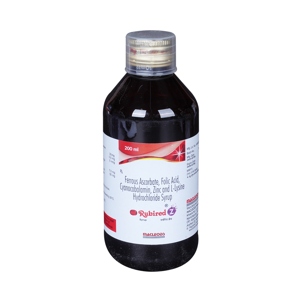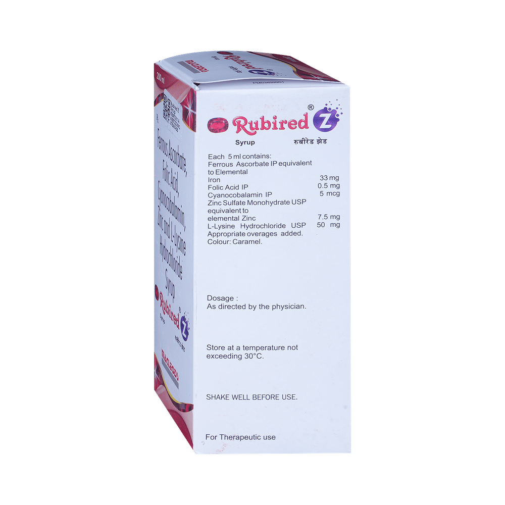 Rubired Z Syrup is a combination of vitamin and mineral supplements prescribed to treat certain nutritional deficiencies in the body. It ensures the proper growth and functioning of the body and strengthens immunity. Rubired Z Syrup may be taken with or without food. Take it in the exact dose and duration prescribed by your doctor. Continue taking this medicine for as long as your doctor has prescribed it even if you feel better. Stopping this medicine abruptly may cause symptoms to return.This medicine is generally safe and does not cause any side effects. However, if you experience any symptoms on taking the medicine, inform your doctor. They may be able to help by adjusting the dosage or prescribing you an alternative medicine.Do not take Rubired Z Syrup if you have a known history of allergic reactions to any of the ingredients of this medicine. Let your doctor know if you are taking, have recently taken, or might take any other medicines. To ensure that this medication is safe for you, also inform the doctor if you have any pre-existing medical conditions, are pregnant, or are breastfeeding.