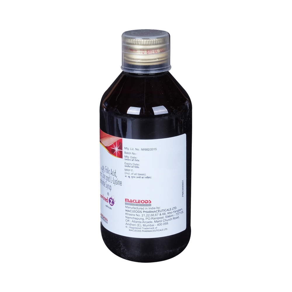 The combination of Cyanocobalamin (Vitamin B12), Elemental Iron, Folic Acid (Vitamin B9), Lysine, and Zinc in a syrup is often prescribed as a nutritional supplement to address various deficiencies and promote overall health. Cyanocobalamin is essential for the formation of red blood cells and the proper functioning of the nervous system. Iron is a vital mineral that is necessary for the formation of hemoglobin, the protein in red blood cells that carries oxygen from the lungs to the rest of the body. Folic acid is important for DNA synthesis, cell division, and the formation of red blood cells. Lysine is an essential amino acid that plays a role in protein synthesis and tissue repair. Zinc is a trace mineral that is involved in numerous enzymatic reactions in the body. It plays a key role in immune function, wound healing, and DNA synthesis.