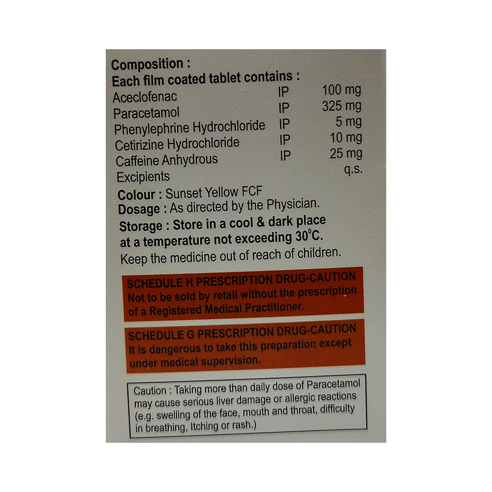 Salt Composition: Aceclofenac (100mg) + Paracetamol (325mg) + Cetirizine (5mg) + Phenylephrine (10mg) + Caffeine (25mg)