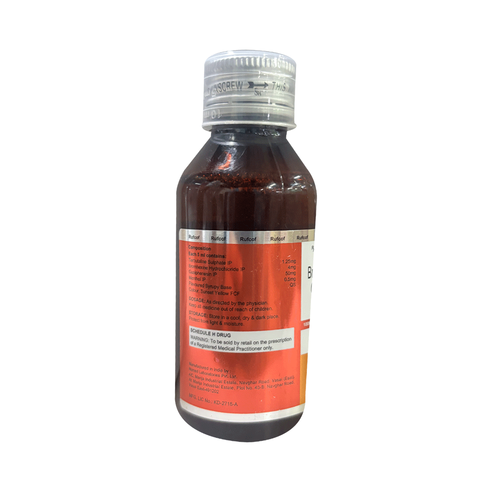 Rufcof Syrup is used in the treatment of cough. It thins mucus in the nose, windpipe and lungs, making it easier to cough out. It also produces a sensation of coolness and relieves minor throat irritation. Rufcof Syrup is taken with or without food in a dose and duration as advised by the doctor. The dose you are given will depend on your condition and how you respond to the medicine. You should keep taking this medicine for as long as your doctor recommends. If you stop treatment too early your symptoms may come back and your condition may worsen. Let your doctor know about all other medications you are taking as some may affect, or be affected by this medicine.The most common side effects are nausea, indigestion, bloating, vomiting, diarrhea, stomach pain, headache, sweating, skin rash, tremors, and increased heart rate. Most of these are temporary and usually resolve with time. Contact your doctor straight away if you are at all concerned about any of these side effects. This medicine can also cause sleepiness, so do not drive or do anything that requires mental focus until you know how this medicine affects you. Avoid drinking alcohol while taking this medicine as it can make sleepiness worse.Never support self-medication or recommend your medicine to another person. It is beneficial to have plenty of fluids while taking this medication. Before taking this medicine, you should tell your doctor if you are pregnant, planning pregnancy or breastfeeding.