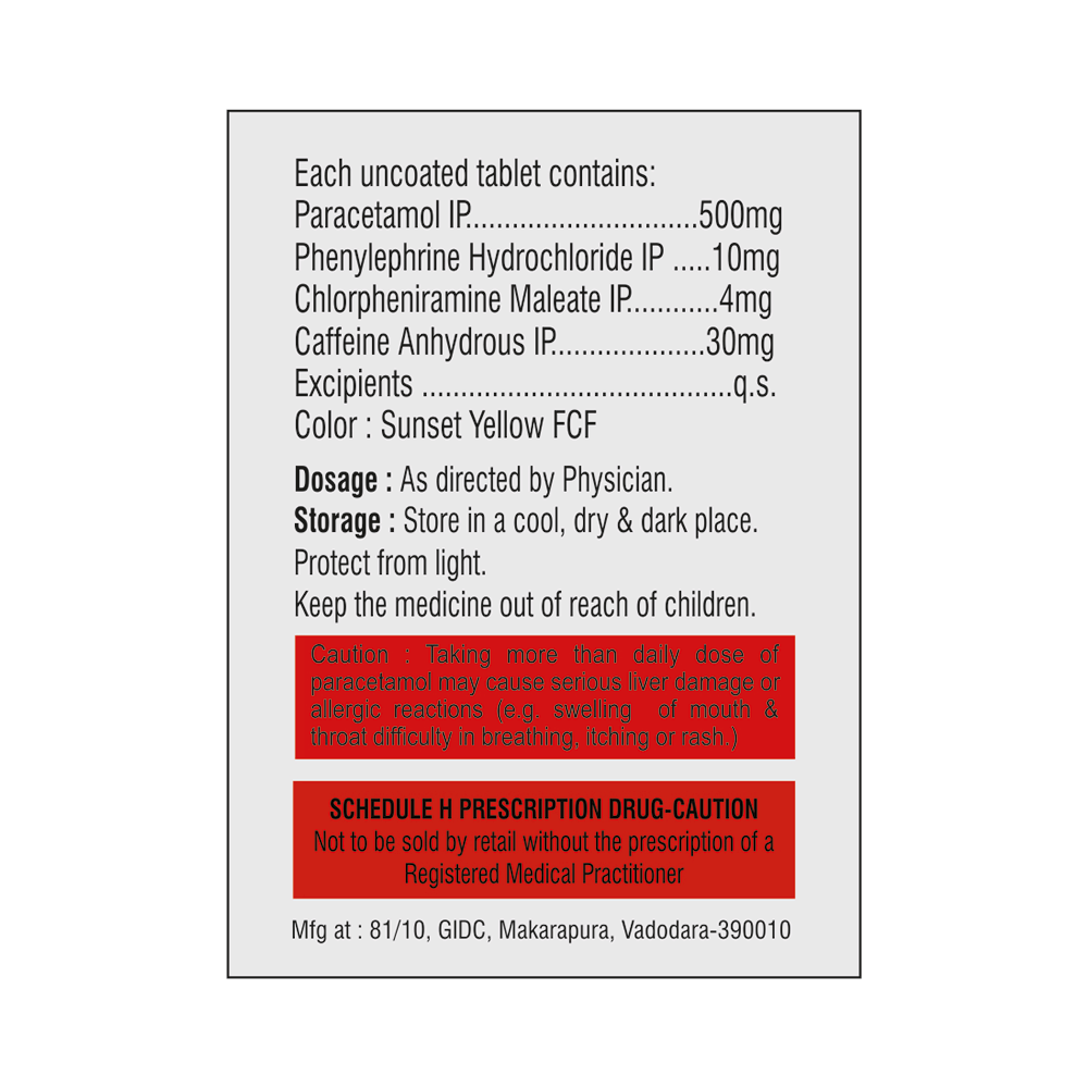 Salt Composition: Caffeine (30mg) + Chlorpheniramine Maleate (4mg) + Paracetamol (500mg) + Phenylephrine (10mg)