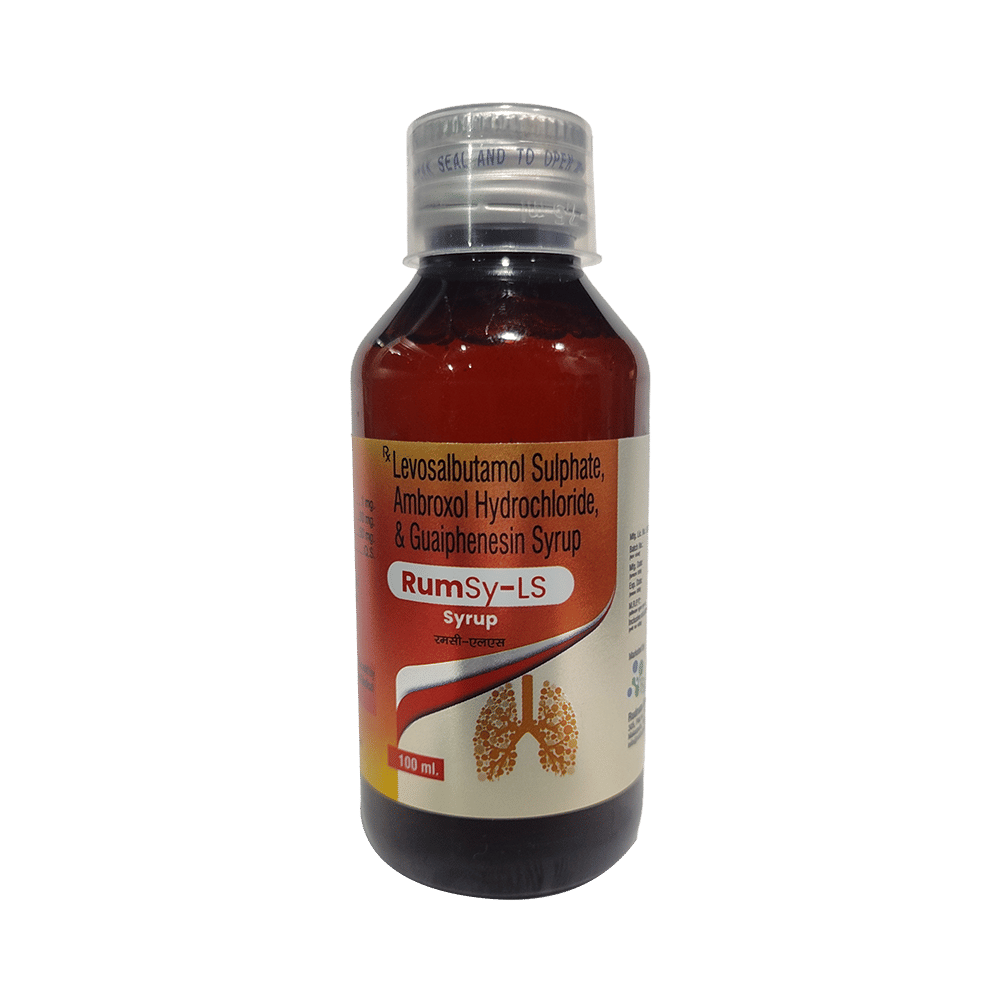 Rumsy-LS Syrup is a combination of three medicines: Levosalbutamol, Ambroxol and Guaifenesin which relieve cough with mucus. Levosalbutamol is a bronchodilator. It works by relaxing the muscles in the airways and widens airways. Ambroxol is a mucolytic which thins and loosens mucus (phlegm), making it easier to cough out. Guaifenesin is an expectorant which decreases the stickiness of mucus (phlegm) and helps in its removal from the airways.