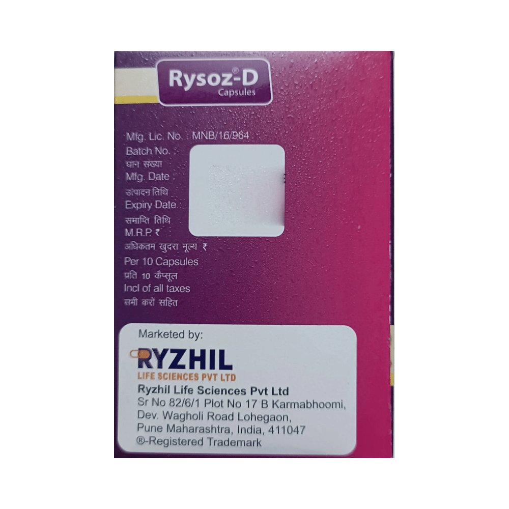 Rysoz-D Capsule SR is a prescription medicine used to treat gastroesophageal reflux disease (acid reflux). It helps relieve symptoms such as heartburn, stomach pain, or irritation. It also neutralizes the acid in the stomach and promotes easy gas passage to reduce stomach discomfort. Rysoz-D Capsule SR is best taken on an empty stomach. Take it in the dose and duration advised by the doctor. Continue taking this medicine for as long as your doctor recommends. If you stop treatment too early, your symptoms may come back, and your condition may worsen. Let your doctor know about all other medications you are taking, as some may affect, or be affected by, this medicine.The most common side effects of Rysoz-D Capsule SR include diarrhea, flatulence, stomach pain, dryness in the mouth, and headache. Most of these are temporary and usually resolve with time. Contact your doctor straight away if you are at all concerned about any side effects. It may also cause sleepiness and dizziness, so do not drive or do anything that requires mental focus until you know how this medicine affects you.Before taking this medicine, you should tell your doctor if you are pregnant, planning pregnancy, or breastfeeding. You should also tell your doctor if you have severe liver disease so that your doctor can prescribe a suitable dose for you. Lifestyle modifications like having cold milk and avoiding hot tea, coffee, spicy food, or chocolate can help you get better results.