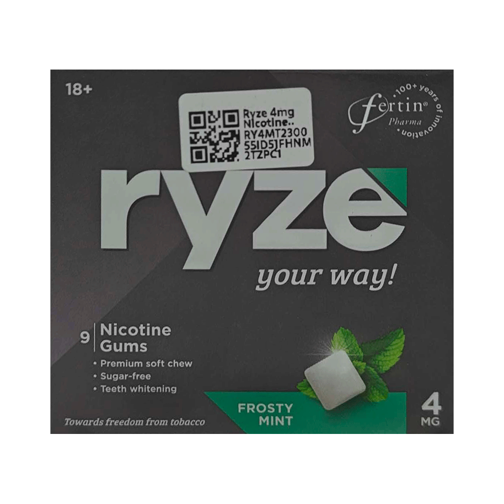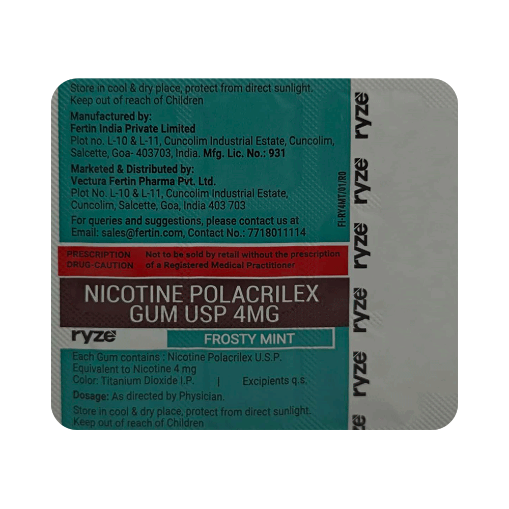 Ryze 4mg Nicotine Gum Frosty Mint is a medicine used to quit smoking by reducing the craving for a cigarette and the irritable feeling that occurs when you stop smoking. It works by mimicking the effect of nicotine by binding to the nicotine receptors in the brain. Ryze 4mg Nicotine Gum Frosty Mint can be used to help you stop smoking completely or cut down the amount you smoke. Stopping smoking is hard and you need to be ready and committed. But quitting is one of the most important things you can do to improve your health and live longer. This medicine should be taken as advised by doctor as it can be habit forming. In case you have missed any dose, take it as soon as you remember it. Do not skip any doses and finish the full course of treatment. However, before taking this medicine it is better to inform doctor if you are suffering from any heart, liver or kidney disease. You must not smoke while using this medicine as it can result in dangerous effects.Many people use more than one type of nicotine replacement therapy (NRT) to improve their chances such as nose or mouth sprays which also contain nicotine. You are more likely to be successful if you also have counselling, join a support group and make some behaviour changes such as avoiding situations you associate with smoking.Some of the common side effects include nausea, vomiting, sore throat and mouth. It may also cause dizziness and sleepiness, so do not drive or do anything that requires mental focus until you feel better. It may cause headaches, so it is better to take plenty of fluids whole day but inform your doctor if it does not go away. These effects are often mild and will wear off with time. If you are pregnant or breastfeeding you must consult doctor before taking this medicine.