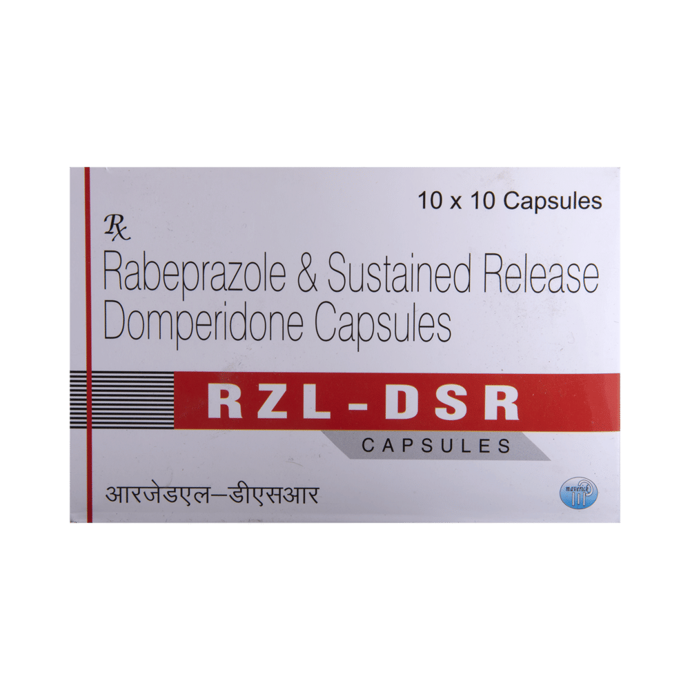RZL-DSR Capsule is a combination of two medicines: Domperidone and Rabeprazole. Domperidone is a prokinetic that works on the upper digestive tract to increase the movement of the stomach and intestines, allowing the food to move more easily through the stomach. Rabeprazole is a proton pump inhibitor (PPI) which works by reducing the amount of acid in the stomach, which helps in the relief of acid-related indigestion and heartburn.