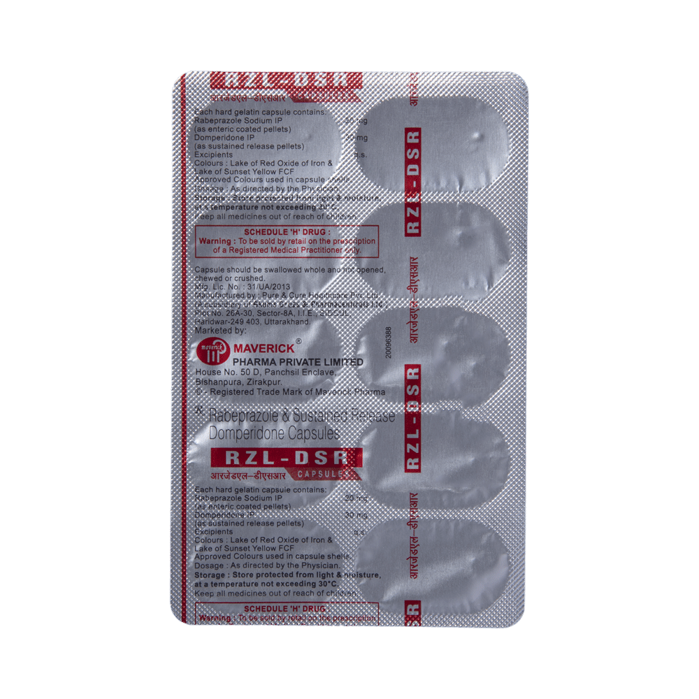 RZL-DSR Capsule is a combination medicine used to treat gastroesophageal reflux disease (acid reflux). It works by relieving the symptoms of acidity such as heartburn, stomach pain, or irritation. It also neutralizes the acid and promotes easy passage of gas to reduce stomach discomfort. RZL-DSR Capsule is taken without food in a dose and duration as advised by the doctor. The dose you are given will depend on your condition and how you respond to the medicine. You should keep taking this medicine for as long as your doctor recommends. If you stop treatment too early your symptoms may come back and your condition may worsen. Let your healthcare team know about all other medications you are taking as some may affect, or be affected by this medicine.The most common side effects are diarrhea, stomach pain, dryness in the mouth, headache, flatulence, and weakness. Most of these are temporary and usually resolve with time. Contact your doctor straight away if you are at all concerned about any of these side effects. This medicine may cause dizziness and sleepiness, so do not drive or do anything that requires mental focus until you know how this medicine affects you. Avoid drinking alcohol while taking this medicine as it can worsen your sleepiness. Lifestyle modifications like having cold milk and avoiding hot tea, coffee, spicy food or chocolate can help you to get better results.Before you start taking this medicine it is important to inform your doctor if you are suffering from kidney or liver disease. You should also tell your doctor if you are pregnant, planning pregnancy or breastfeeding.