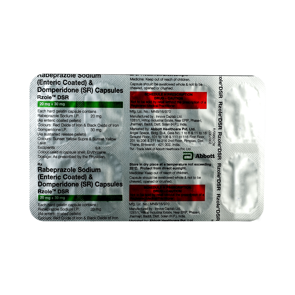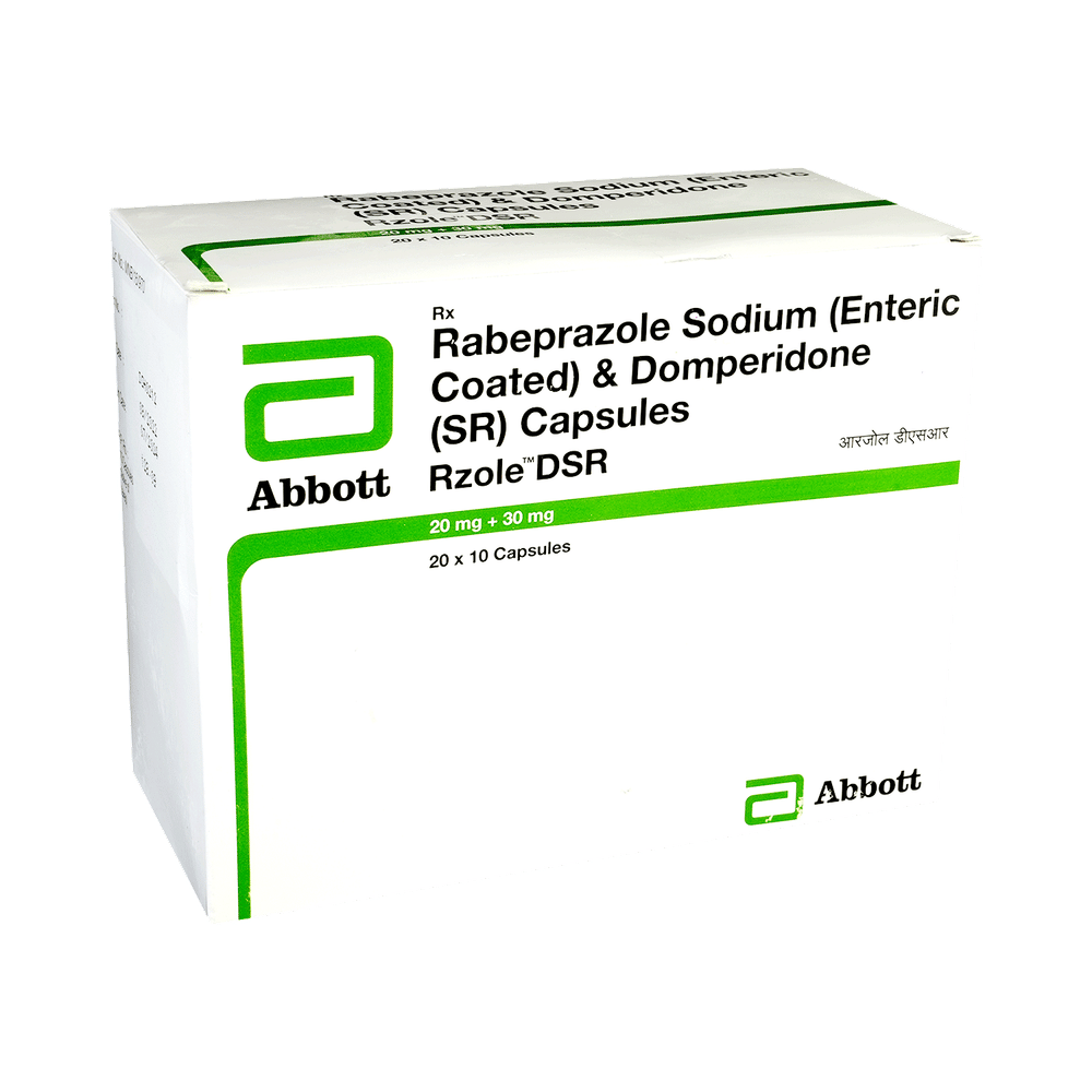 Rzole DSR Capsule is a combination medicine used to treat gastroesophageal reflux disease (acid reflux). It works by relieving the symptoms of acidity such as heartburn, stomach pain, or irritation. It also neutralizes the acid and promotes easy passage of gas to reduce stomach discomfort. Rzole DSR Capsule is taken without food in a dose and duration as advised by the doctor. The dose you are given will depend on your condition and how you respond to the medicine. You should keep taking this medicine for as long as your doctor recommends. If you stop treatment too early your symptoms may come back and your condition may worsen. Let your healthcare team know about all other medications you are taking as some may affect, or be affected by this medicine.The most common side effects are diarrhea, stomach pain, dryness in the mouth, headache, flatulence, and weakness. Most of these are temporary and usually resolve with time. Contact your doctor straight away if you are at all concerned about any of these side effects. This medicine may cause dizziness and sleepiness, so do not drive or do anything that requires mental focus until you know how this medicine affects you. Avoid drinking alcohol while taking this medicine as it can worsen your sleepiness. Lifestyle modifications like having cold milk and avoiding hot tea, coffee, spicy food or chocolate can help you to get better results.Before you start taking this medicine it is important to inform your doctor if you are suffering from kidney or liver disease. You should also tell your doctor if you are pregnant, planning pregnancy or breastfeeding.