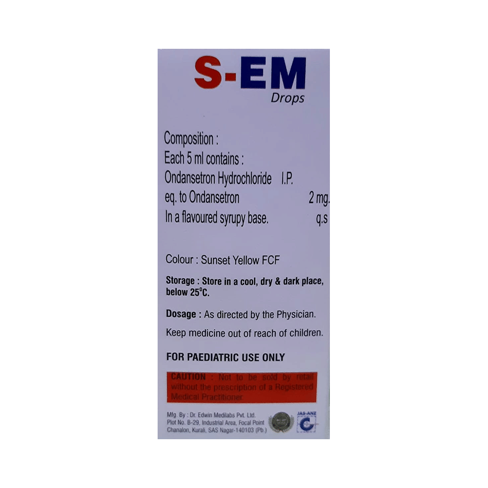 S-EM Oral Drop Mango is a medicine given to children to help treat nausea and vomiting. It is mainly given to treat nausea and vomiting associated with surgery, chemotherapy, radiotherapy, and stomach/intestinal infection. It also helps treat vomiting that is caused as a side effect of medicines like painkillers. S-EM Oral Drop Mango may be given before or after meals. To control vomiting caused due to chemotherapy, give this medicine to your child 30 minutes before the procedure. Give it 1 to 2 hours before a radiotherapy session and 1 hour before surgery to prevent your child from vomiting post these procedures. If your child expels out the medicine within 30 minutes of the intake, help your child calm down and repeat the dose. Do not double dose if it is already time for the next dose.S-EM Oral Drop Mango may cause some temporary side effects such as headache, constipation, diarrhea, and fatigue. These side effects usually subside once your child’s body adapts to the medicine. In case these side effects persist or become bothersome, do reach out to the doctor on a priority basis.Let the doctor know about all the medicines your child is taking, including painkillers, antibiotics, or medicines taken to treat depression. Also, inform the doctor if your child has a history of liver problems, kidney malfunction, blockage in the gastrointestinal tract, heart problems, or allergies to any medicine, its ingredients, or a food product. This information is very important for dose alterations and for planning your child’s overall treatment.