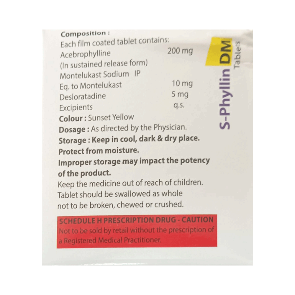 S-Phyllin DM Tablet SR is a combination medicine used in the prevention of asthma. It relieves allergy symptoms such as runny nose, stuffy nose, sneezing, watery eyes, and congestion or stuffiness. It also helps relax the air passages' muscles, thus widening it and making it easier to breathe. S-Phyllin DM Tablet SR is taken with or without food in a dose and duration as the doctor advises. Your dose will depend on your condition and how you respond to the medicine. You should keep taking this medicine for as long as your doctor recommends. If you stop treatment too early, your symptoms may come back, and your condition may worsen. Let your healthcare team know about all other medications you are taking, as some may affect or be affected by this medicine.The most common side effects are nausea, vomiting, stomach pain, diarrhea, dry mouth, flu-like symptoms, skin rash, fatigue, headache, and breathing difficulty. Most of these are temporary and usually resolve with time. If you are concerned about these side effects, contact your doctor immediately.This medicine may cause dizziness and sleepiness, so do not drive or do anything that requires mental focus until you know how this medicine affects you. Avoid drinking alcohol while taking this medicine, as it can worsen your sleepiness. Before taking it, you should tell your doctor if you have any kidney or liver diseases so that your doctor can prescribe a suitable dose for you. You should also tell your doctor if you are pregnant, planning pregnancy, or breastfeeding.