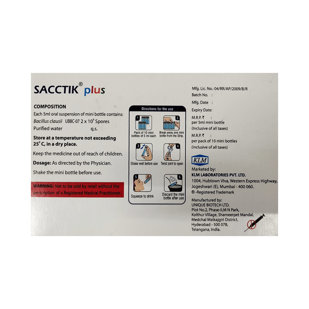 Sacctik Plus Oral Suspension (5ml Each) is a probiotic. It works by restoring the balance of good bacteria in the intestine that may get upset after antibiotic use or due to intestinal infections.