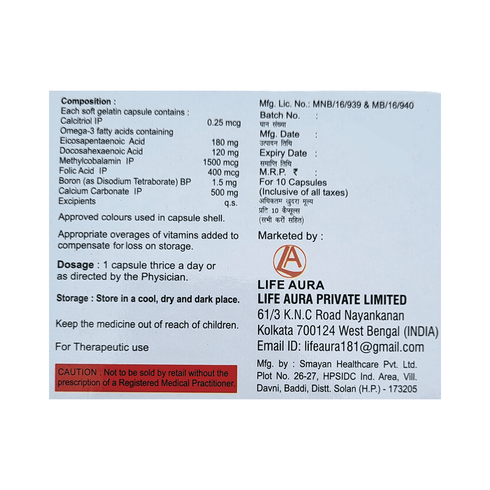Salt Composition: Calcitriol (0.25mcg) + Calcium Carbonate (500mg) + Omega-3 fatty acid (300mg) + Methylcobalamin (1500mcg) + Folic Acid (400mcg) + Boron (1.5mg)