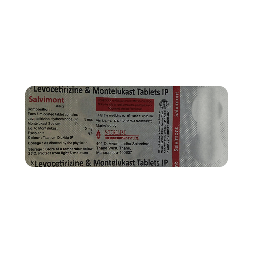 In Treatment of Allergic skin conditionsSalvimont Tablet is effective in treating allergic skin conditions with inflammation and itching. It reduces the actions of chemicals in the body that cause inflammation of the skin. When used correctly it is a safe and effective treatment. It reduces the redness, rash, pain or itchiness caused by your skin’s reaction to an irritant. It thus improves your self-esteem and confidence as your appearance changes. Keep taking it for as long as it is prescribed to get the full benefits.In Treatment of Sneezing and runny nose due to allergiesSalvimont Tablet is a combination medicine that provides relief from symptoms such as blocked or runny nose, sneezing and itchy or watery eyes. This will make it easier for you to go about your daily activities. It rarely has any serious side effects and you may only need to take it on days you have symptoms. If you are taking it to prevent getting symptoms you should use it regularly to get the most benefit.In Treatment of Hay feverHay fever, also called allergic rhinitis, causes cold-like signs and symptoms, such as a runny nose, itchy eyes, congestion, sneezing and sinus pressure. The only difference is that in hay fever, these symptoms are not produced due to a virus but are simply allergic responses of our body to allergens (allergy causing agents such as pollen). Salvimont Tablet is used to provide relief from these symptoms of hay fever. It works by blocking the release of the chemical substance responsible for producing such allergy symptoms. Salvimont Tablet is a safe medicine which helps treat hay fever and makes us feel at ease.show moreshow less
