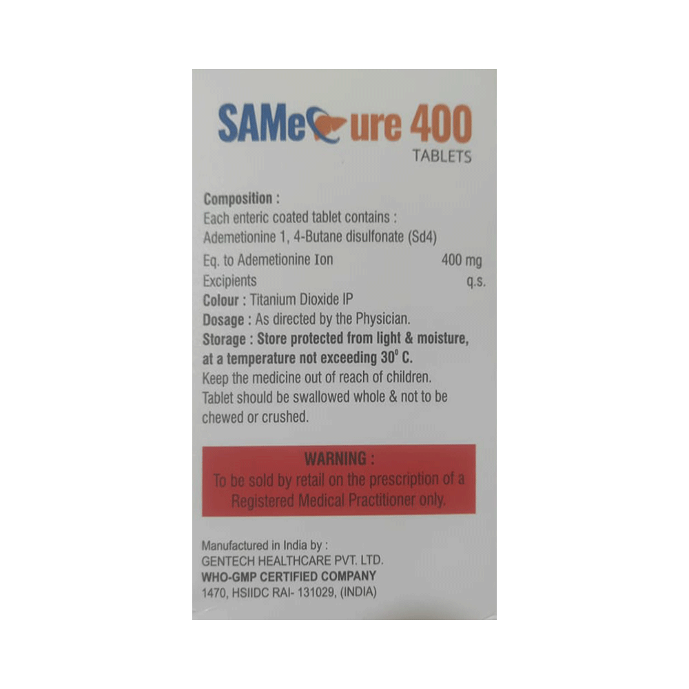 Samecure 400 Tablet is a medicine used in the treatment of lintrahepatic cholestasis and other chronic liver diseases. It works by restoring the natural compound in the liver that helps protects liver cells from damage, improves the flow of bile, and supports overall healthy liver function. Samecure 400 Tablet has also been studied for its possible role in cell membrane stabilization and as adjunctive management of neurodegenerative disorders. Research suggests it may help support brain health, protect nerve cell membranes, and assist in maintaining healthy communication between nerve cells.Samecure 400 Tablet is usually recommended to be taken before meals, as this improves absorption. The exact dose depends on your body weight and the condition being treated. To get the most benefit, it is important to take this medicine regularly and at the same time each day. Treatment may need to continue for several months or longer, depending on your doctor’s advice. Even if your symptoms improve, do not stop taking it unless your doctor tells you to.The most common side effects of Samecure 400 Tablet are nausea, abdominal discomfort, and diarrhea. These effects are usually mild and temporary. If diarrhea becomes bothersome, your doctor may adjust your dose or stop the treatment. Drinking plenty of fluids can help prevent dehydration if you experience diarrhea or constipation. Rarely, some people may also experience headache, trouble sleeping, or skin rash. If any side effect worries you, consult with doctor.Samecure 400 Tablet should be used with caution in patients with a history of bipolar disorder, as this medicine may rarely trigger mood swings. Use during pregnancy and breastfeeding should only be under medical advice. This medicine can interact with other drugs, so let yor doctor know about all the medicines and supplements you are taking. Avoid drinking alcohol while on treatment, as this may increase the strain on your liver and worsen side effects.