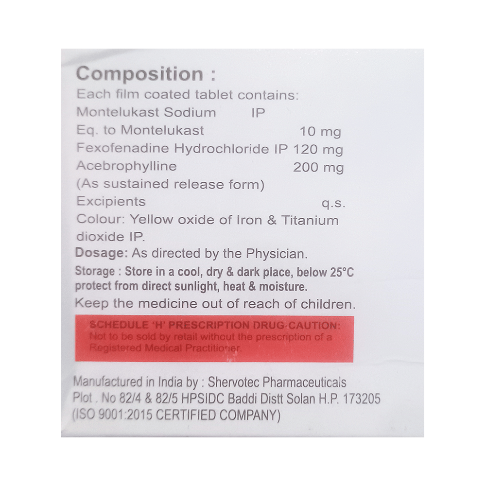 Salt Composition: Montelukast (10mg) + Fexofenadine (120mg) + Acebrophylline (200mg)