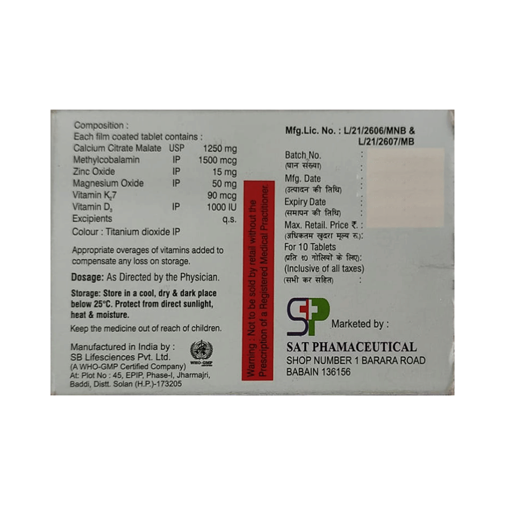 Salt Composition: Calcium Citrate Malate (1250mg) + Vitamin D3 (1000IU) + Vitamin K2-7 (90mcg) + Methylcobalamin (1500mcg) + Magnesium Oxide (50mg) + Zinc Oxide (15mg)