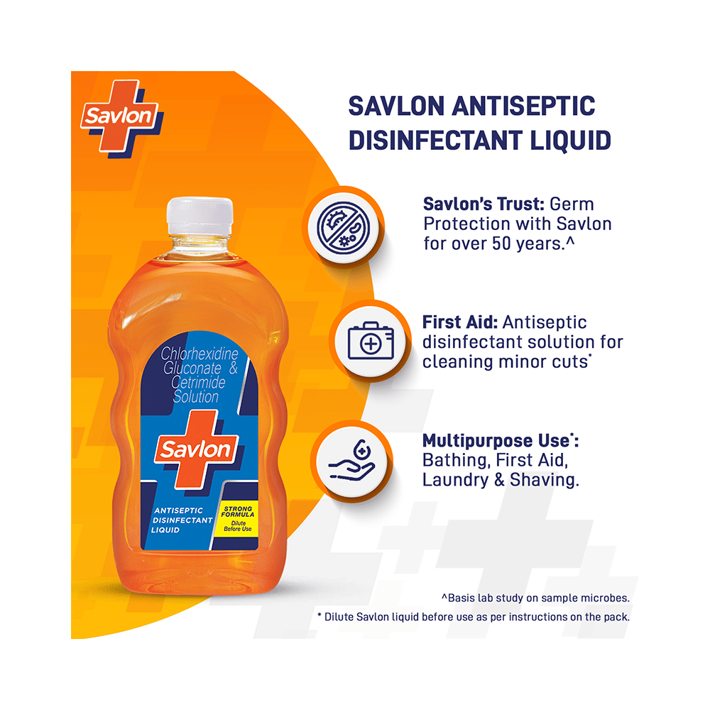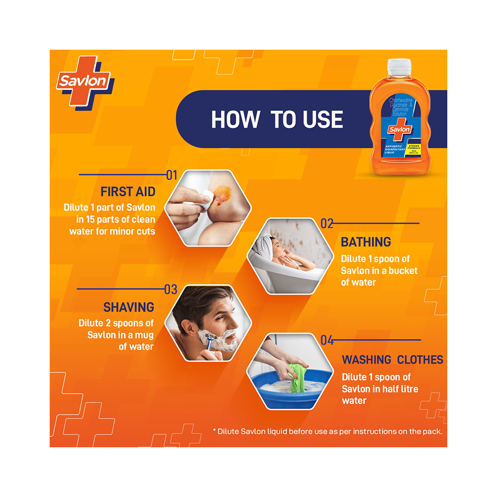 In Treatment of Wound infectionSavlon Antiseptic Disinfectant Liquid is an antiseptic that is used for cleansing and disinfecting the wounds. It kills and prevents the growth of infection-causing microbes, thereby preventing abrasions, cuts, or any break in the skin from getting infected. It also reduces pain, swelling and redness at the wound site. Keep the affected area clean and use the medicine as prescribed by your doctor.