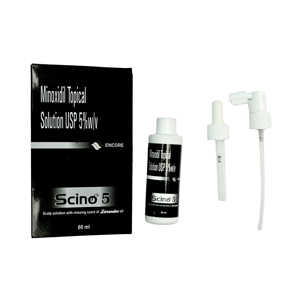 In Treatment of Hair lossScino 5 Solution is a medicine used to treat common hereditary hair loss. It can prevent further hair loss and help hair to regrow. It works by increasing blood flow to the hair follicles on your scalp, which prevents hair cell death and also enhances new hair growth. It is most effective for baldness or thinning at the top of the scalp, but less effective at the front or for receding hairline.Benefits are less likely if you have been bald for many years or have a large area of hair loss. Scino 5 Solution is not suitable for sudden or unexplained hair loss. It is considered a safe medicine. There are separate products for men and women, and you should follow your doctor’s instructions carefully while using Scino 5 Solution. Regrowth of hair improves your appearance, boosts your confidence, and enhances your social life. Use it regularly to maintain hair growth and to get the maximum benefits. Consult your doctor if you notice any changes in the hair growth while using Scino 5 Solution.
