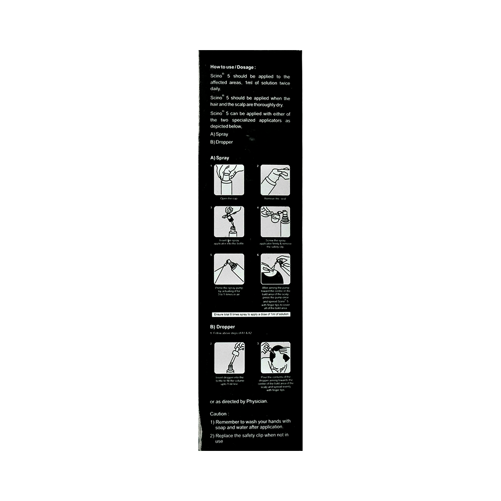 Scino 5 Solution belongs to a class of drugs known as vasodilators. It is used to promote hair growth in men with male pattern baldness by improving blood flow to hair follicles, helping slow hair loss, and encouraging new hair growth when used regularly. Scino 5 Solution should only be applied directly to the scalp area in the amount and in the way specified on the label or by your doctor. Clean and dry your scalp before using it. It may take approximately 2- 4 months to notice any hair growth. The first growth may be soft, colourless, and barely visible. Using more than recommended will not speed up hair growth and may increase the likelihood of side effects. This medication must be used continuously to maintain hair growth. Tell your doctor if your condition does not improve or worsen after using it for 4 to 6 months.The most common side effects of this medicine include itching, excessive hair growth, rash, and dermatitis. In case of accidental application in other areas, it may result in unwanted hair growth. Rinse thoroughly with plenty of water if you get it in your eyes, mouth, or broken skin. Talk to your doctor if you are bothered by the side effects or if they do not go away.People under 18 or over 65 should not usually use Scino 5 Solution. It may also not be appropriate if your hair loss is due to medications (such as chemotherapy) or any nutritional deficiency. You should also not use this medicine if you have high blood pressure or use other creams or lotions to treat other scalp conditions. Talk to your doctor if you have heart disease or blood circulation problems.