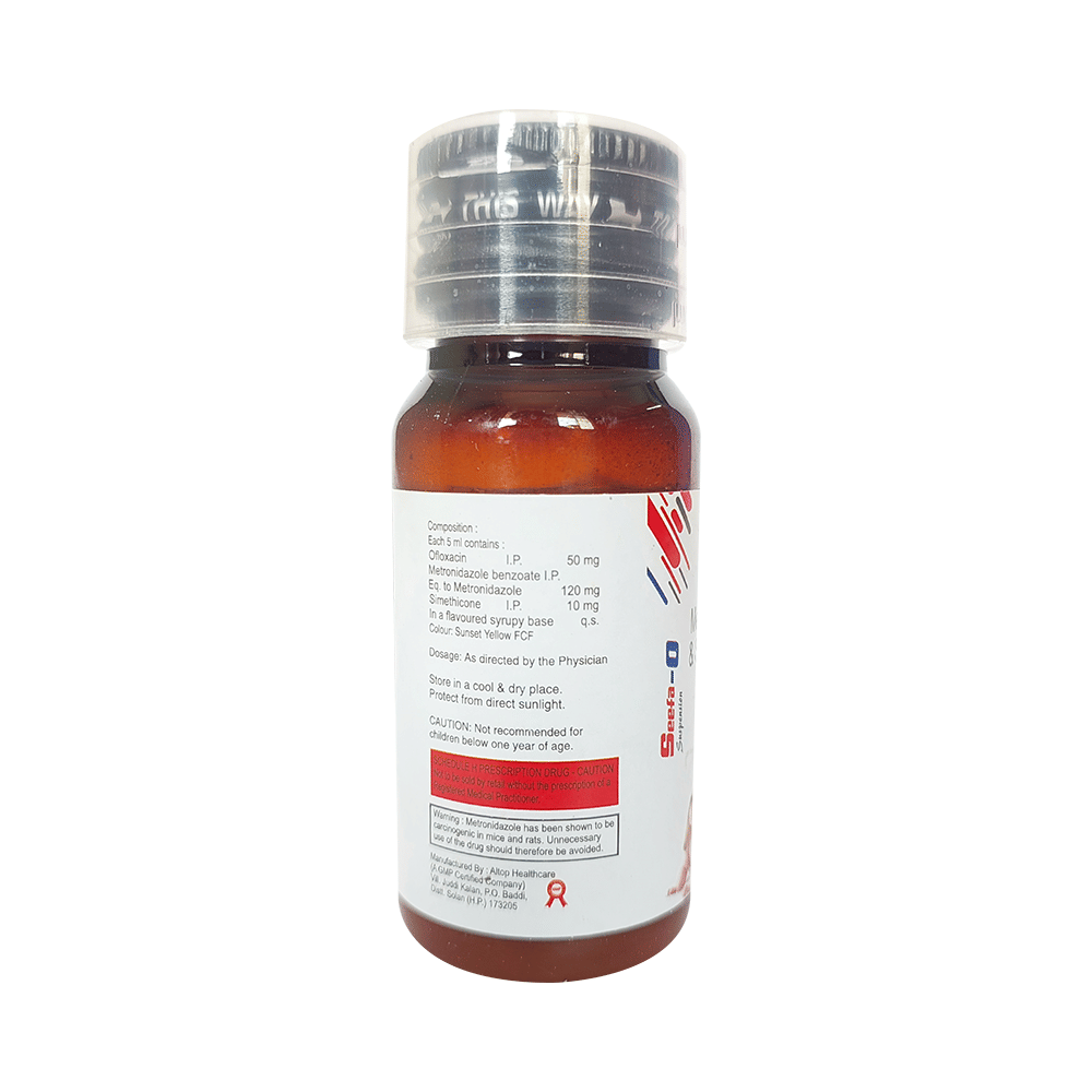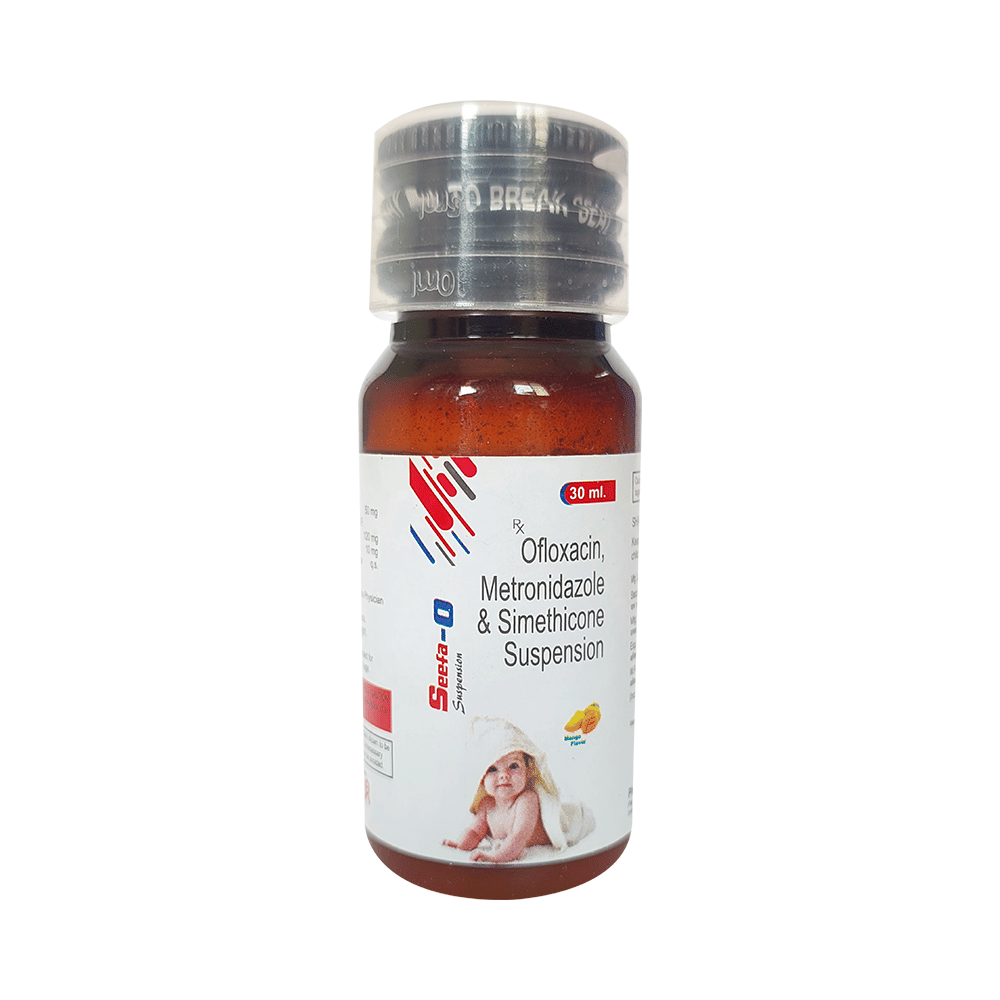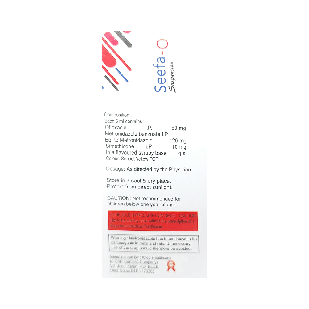 Seefa-O Oral Suspension Mango is a combination of three active ingredients. While two of its ingredients, namely ofloxacin and metronidazole are antibiotics, simethicone is a gas-absorbing agent that improves gastric tolerability of the combination. The antibiotic ingredients interfere with the genetic material of bacteria by impairing its DNA. This kills the infection-causing bacteria, preventing its growth and stopping the infection. On the other hand, Simethicone binds with the gas bubbles produced as a result of the other two ingredients or as a result of some other problem. By doing so, it aids in the removal of gases and provides relief in stomach pain and bloating.