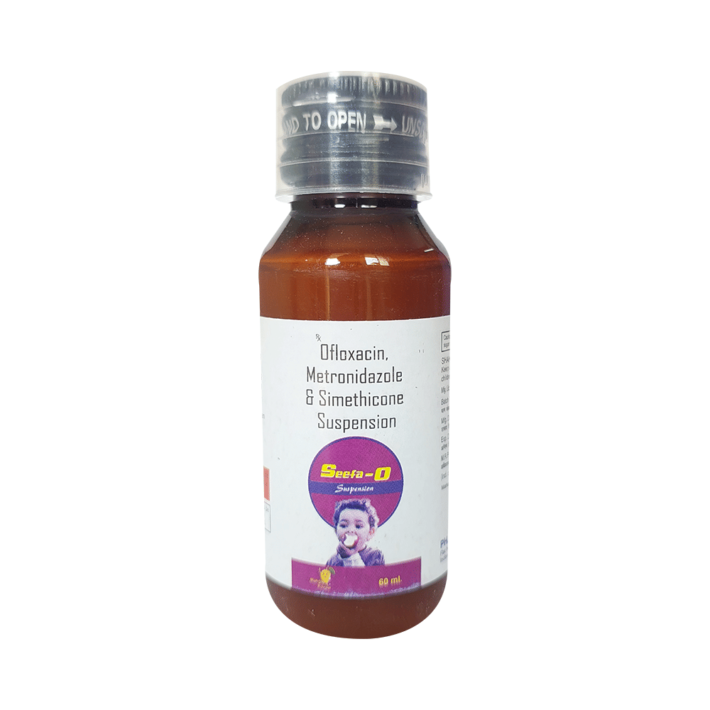 Seefa-O Oral Suspension Mango is a combination of three active ingredients. While two of its ingredients, namely ofloxacin and metronidazole are antibiotics, simethicone is a gas-absorbing agent that improves gastric tolerability of the combination. The antibiotic ingredients interfere with the genetic material of bacteria by impairing its DNA. This kills the infection-causing bacteria, preventing its growth and stopping the infection. On the other hand, Simethicone binds with the gas bubbles produced as a result of the other two ingredients or as a result of some other problem. By doing so, it aids in the removal of gases and provides relief in stomach pain and bloating.