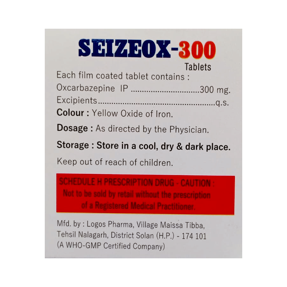 Seizeox 300 Tablet is used to treat and prevent epilepsy (seizures). However, it cannot cure epilepsy and will only work to prevent seizures for as long as you continue to take the medicine. Seizeox 300 Tablet may be used alone or in combination with other medicines. The dose and how often you need to take it will be decided by your doctor so that you get the right amount to control your symptoms. It may be increased gradually. You can take this medicine with or without food but take it at the same time each day to get the most benefit. It usually takes a couple of weeks to work. It is important to take this medicine regularly and for as long as you are advised, even if you feel well. Missing doses may trigger seizures and, if you stop, your condition may get worse. It should never be stopped suddenly.The most common side effects of this medicine include nausea, vomiting, feeling dizzy, tired or drowsy, unsteadiness, and low sodium levels in blood. Most of these are not serious. Keep taking the medicine but talk to your doctor if these side effects bother you or do not go away. However, if you notice a skin rash or redness, tell your doctor straight away. It could develop into a life-threatening skin condition called Stevens-Johnson syndrome. Long-term treatment with this medicine can cause osteoporosis (reduced bone mass) and increase your risk of breaking a bone. Anticonvulsants like this medicine may cause suicidal thoughts and behaviors. If your mood becomes depressed, tell your doctor.This medicine may not be suitable for everybody. Before using it, tell your doctor if you have ever had heart problems, kidney or liver disease, difficulty urinating, depression, or suicidal thoughts. Many other medicines can interfere with it and some should not be taken together so tell your doctor all the medicines you are taking to make sure it is safe. If you are pregnant, do not start or stop taking this medicine without asking your doctor. Drinking alcohol should be avoided as it can increase some of the side effects and can also increase your risk of seizures. You may need frequent blood tests to help your doctor make sure you are taking the right dose both before you start and while you are using it.