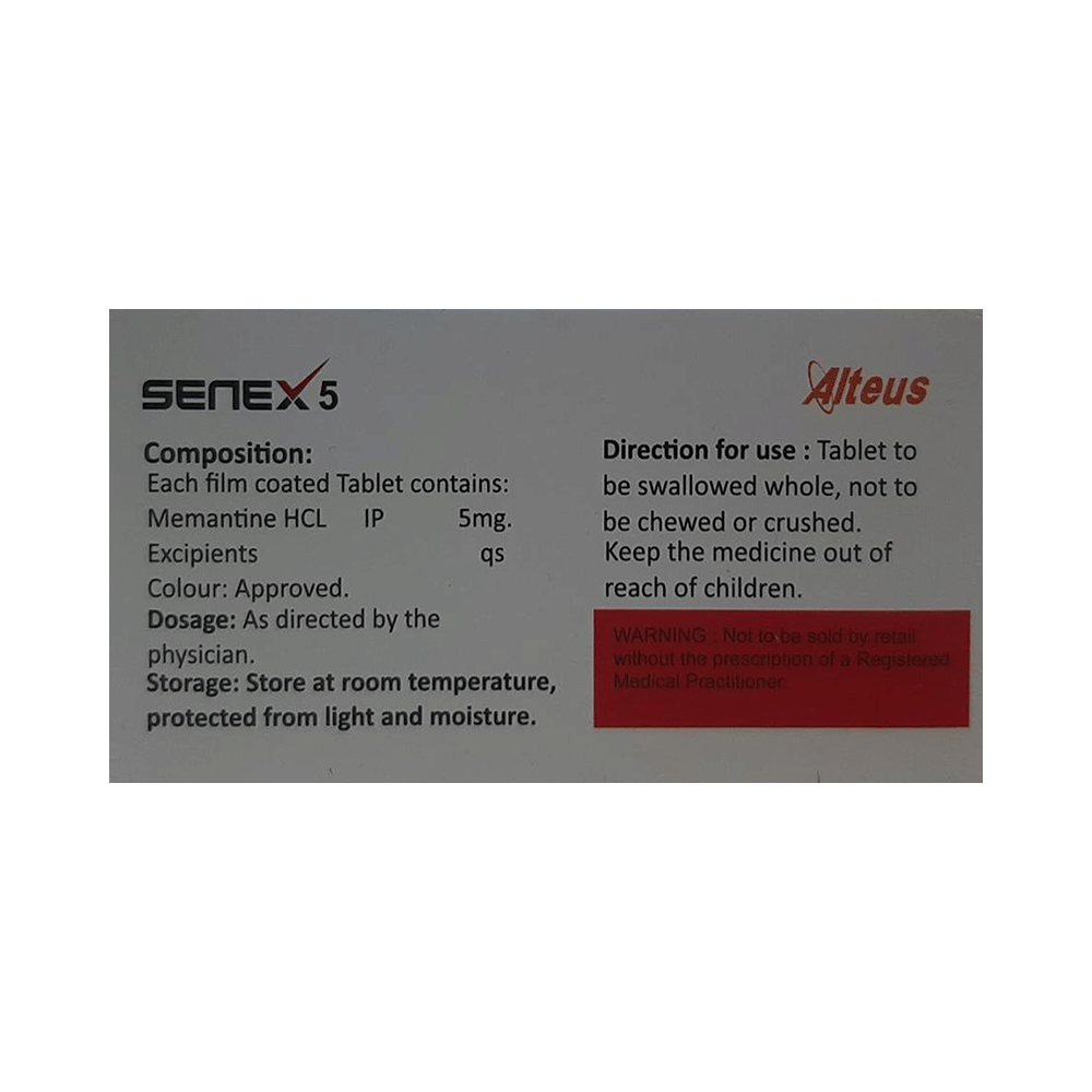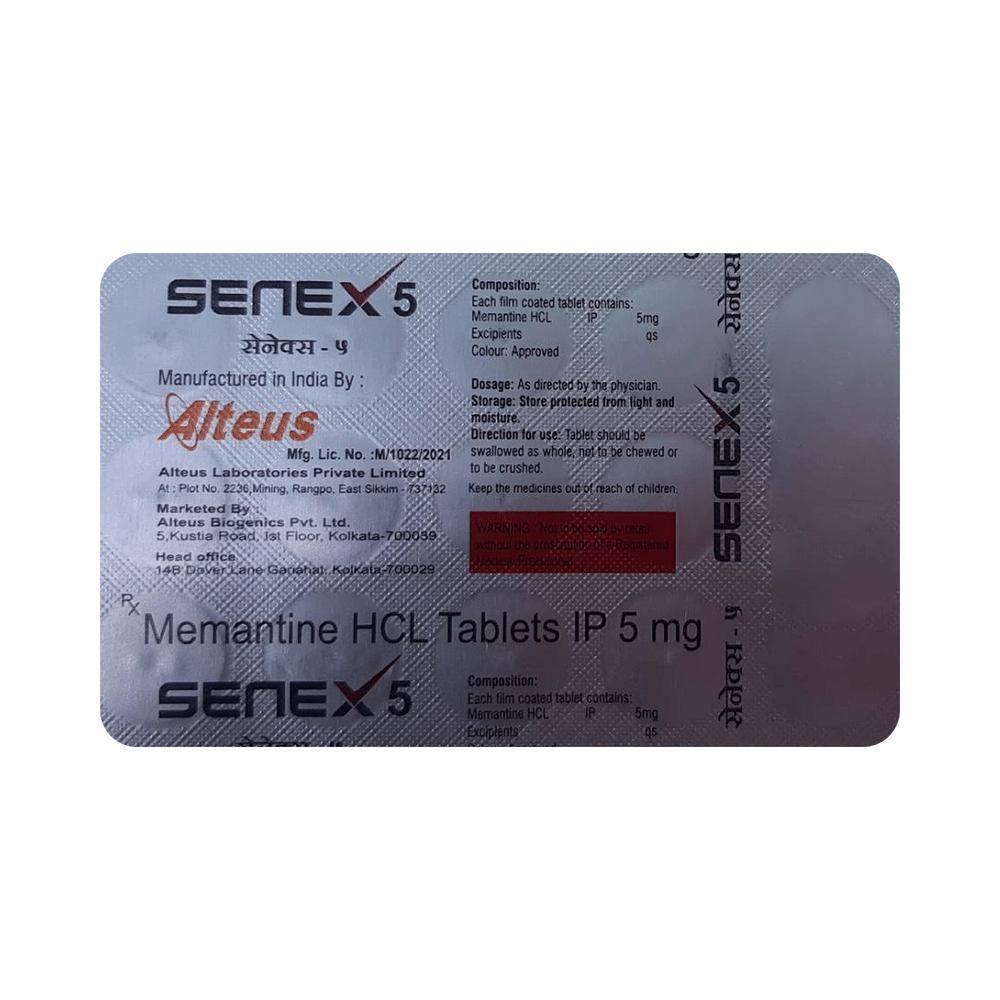 Senex 5 Tablet is a medicine used in the treatment of Alzheimer's disease. It helps to slow down the progression of moderate to severe Alzheimer's disease by improving memory and thinking. This medicine works by blocking a chemical messenger involved in the transmission of nerve signals. Senex 5 Tablet maybe taken with or without food. However, it is advised to take it at the same time each day to maintain a consistent level of medicine in the blood. If you missed a dose, take it as soon as you remember. Do not skip any doses and finish the full course of treatment even if you feel better. It is important that this medication is not stopped suddenly without talking to your doctor.The most common side effects of this medicine are dizziness, headache, confusion, and constipation. It may also cause dizziness and sleepiness, so do not drive or do anything that requires mental focus until you know how this medicine affects you.Before taking this medicine, inform the doctor if you have a history of seizures, kidney disease, heart disease, or liver disease. Let your doctor also know if you are taking any other medicines for any medical conditions. Pregnant and breastfeeding women should consult their doctors before taking this medicine.