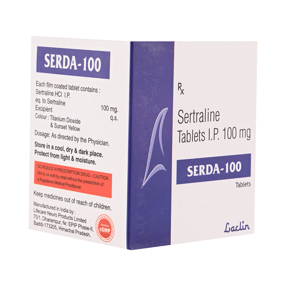 Serda 100 Tablet is a medicine that is used to treat major depressive disorder (MDD) and obsessive-compulsive disorder (OCD). It works by increasing the levels of serotonin, a natural chemical in the brain that plays an important role in mood, emotions, and behavior. Serda 100 Tablet should be taken exactly as prescribed by your doctor. It can be taken with or without food, but it is best to take it at the same time each day to help you remember. Treatment for depression and OCD often takes several weeks before you start to feel the full benefit, so it is important to keep taking the medicine regularly and not stop suddenly, even if you feel better.Stopping the medicine too quickly may cause withdrawal symptoms or make your condition return. For the best results, combine the treatment with healthy habits such as regular sleep, exercise, and support from family, friends, or counseling if recommended.Some common side effects of Serda 100 Tablet include nausea, indigestion, loss of appetite, increased sweating, tremors, insomnia (difficulty in sleeping), and diarrhea. Sexual side effects like decreased sexual drive, delayed ejaculation, and erectile dysfunction may also be seen. Let your doctor know straight away if you develop any sudden worsening of mood or any thoughts about harming yourself.Before taking this medicine, you should tell your doctor if you have epilepsy (seizure disorder or fits), diabetes, liver or kidney disease, heart problems, or glaucoma. These may affect your treatment. Pregnant or breastfeeding women should also consult their doctor before taking it. Some other medicines may affect the way it works, especially other antidepressants and medicines called MAO inhibitors. Inform your doctor about all the medicines you are taking to make sure you are safe.