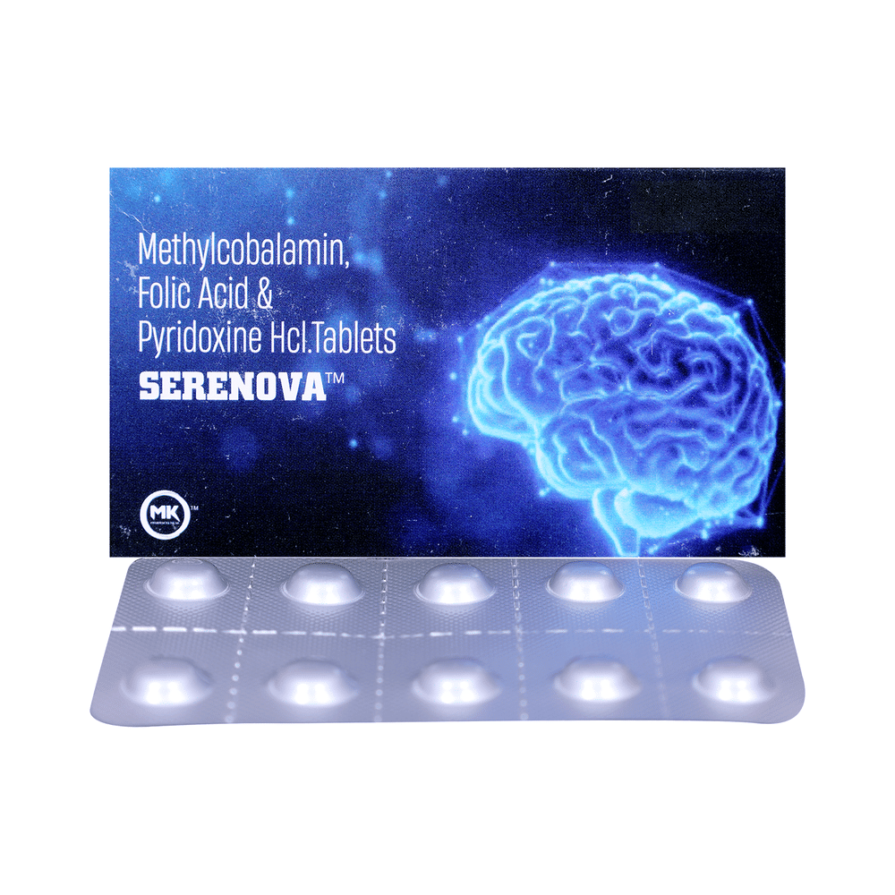 Serenova Tablet is a combination of three nutritional supplements: Methylcobalamin, Vitamin B6 (Pyridoxine), and Folic Acid. They replenish the body's stores of important nutrients.