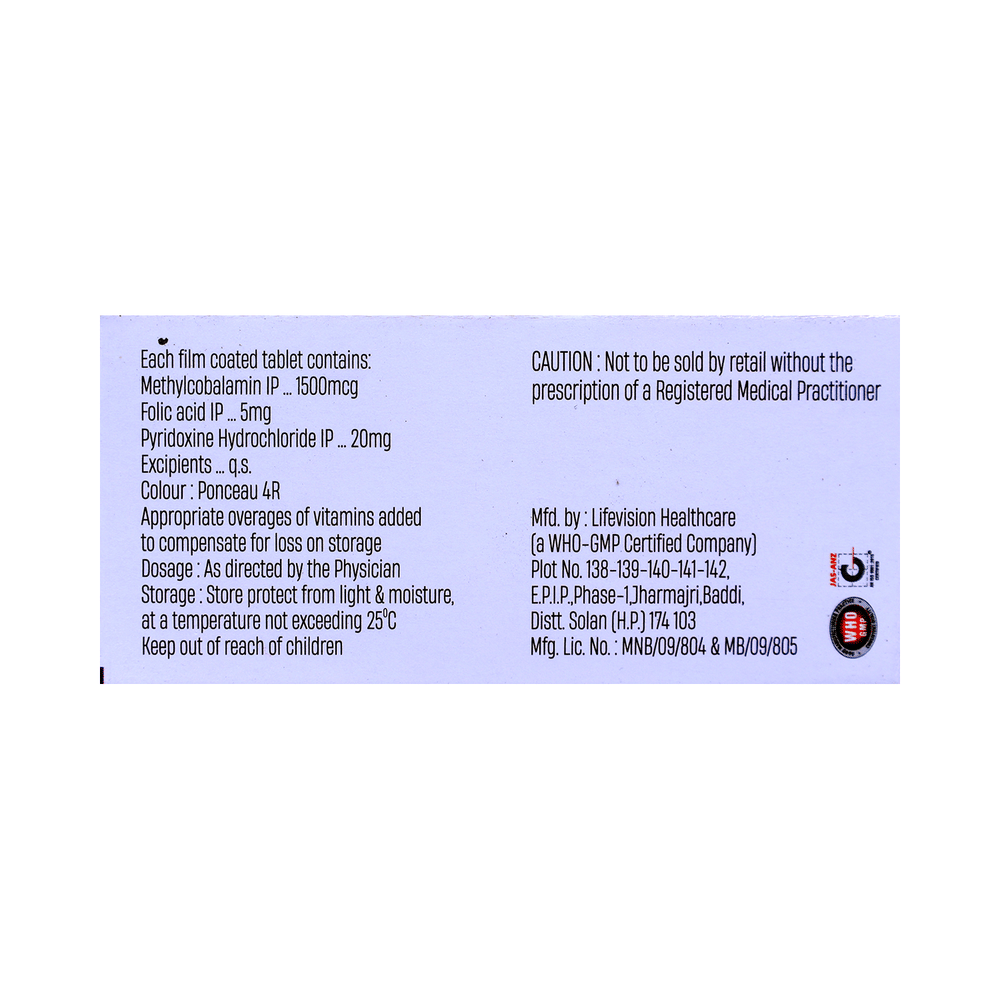 Salt Composition: Methylcobalamin (1500mcg) + Vitamin B6 (Pyridoxine) (20mg) + Folic Acid (5mg)