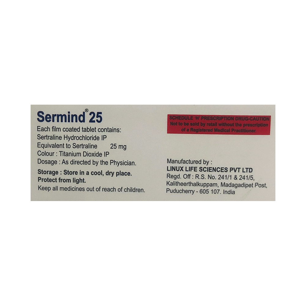 Sermind 25 Tablet is a selective serotonin reuptake inhibitor (SSRI) antidepressant. It works by increasing the levels of serotonin, a chemical messenger in the brain. This improves mood and physical symptoms of depression and also relieves symptoms of obsessive-compulsive disorder.
