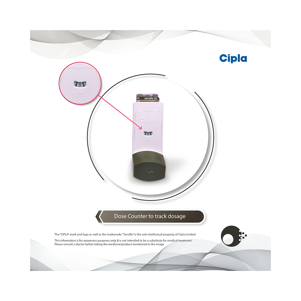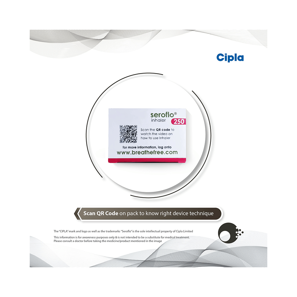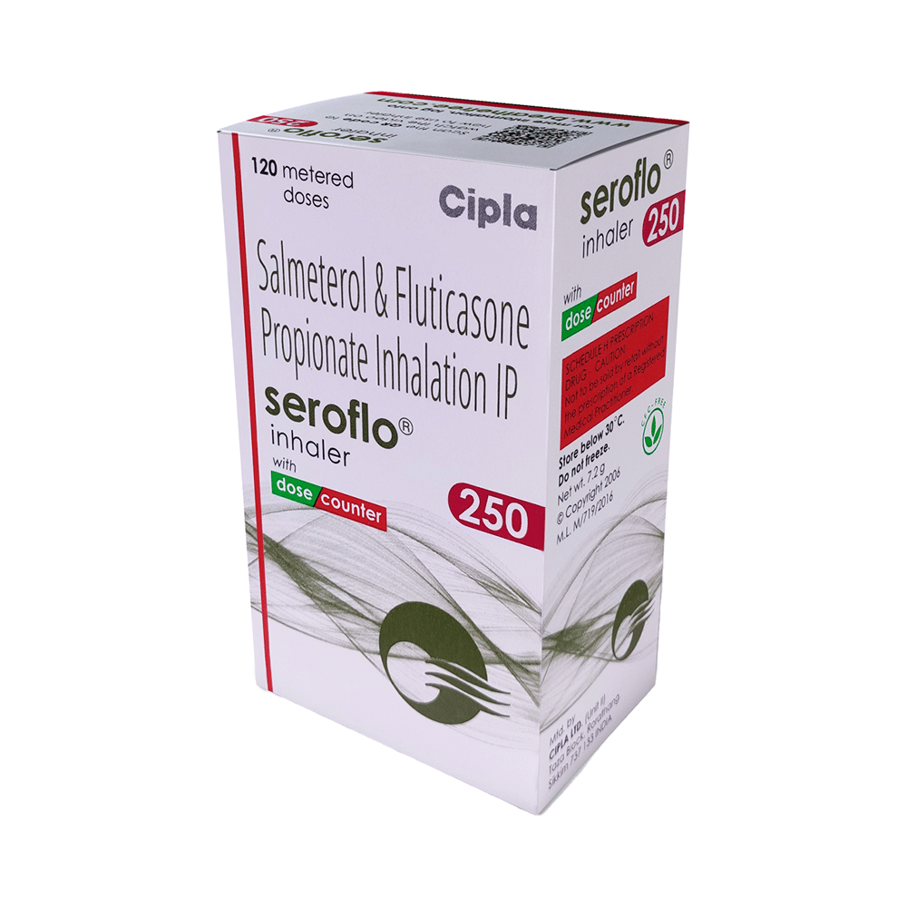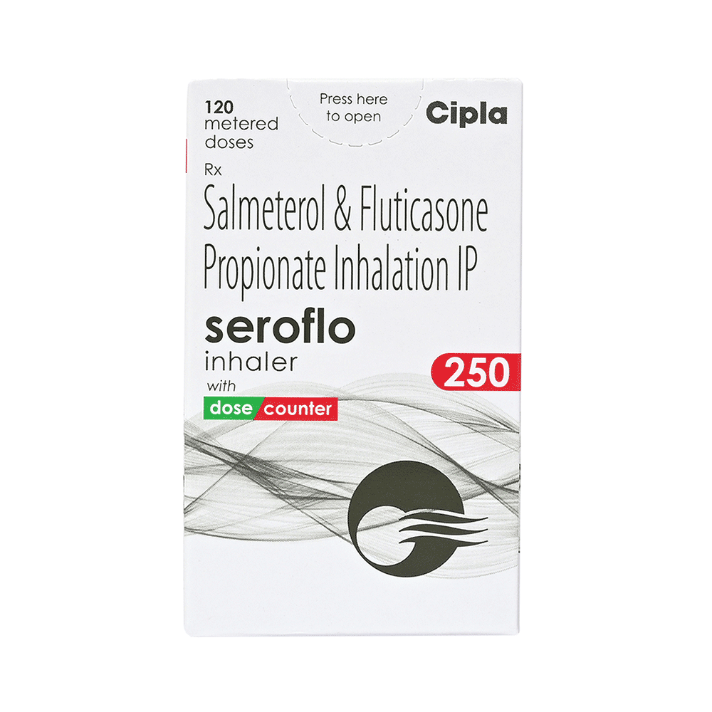 Seroflo 250 Inhaler is a combination of two medicines that opens the airways and makes it easier to breathe. It is used in the treatment of asthma (wheezing and shortness of breath) and chronic obstructive pulmonary disorder (a lung disorder in which the flow of air to the lungs is blocked). Your doctor will tell you how often you need to use your inhaler. The effect of this medicine may be noticeable after a few days but will only reach its maximum after a few weeks. This medicine must be used regularly to be effective, so go on taking it even if you don't have any symptoms. That means it’s doing its job. If you stop taking it your asthma and chronic obstructive pulmonary disorder (COPD) may get worse. It should not be used to relieve sudden asthma attacks. If an asthma attack occurs, use your quick-relief inhaler (reliever). To get the benefit from this medicine you need to make sure you get your inhaler technique right, otherwise, it does not work as well.The most common side effects are nausea, vomiting, respiratory tract infection, fungal infections in the mouth, headache, hoarseness of voice, sore throat, cough, musculoskeletal (bone, muscle, or joint) pain, and increased heart rate. If you get there, do not stop taking it but do talk to your doctor. You can help prevent some of these symptoms by rinsing your mouth and throat with water or brushing your teeth after using your inhaler. There are other, rarer side effects that can be serious. Talk to your doctor if you're worried about them. In general, you should be trying to avoid situations that make your asthma worse (your triggers) and try not to smoke.Ask your doctor whether it’s safe to take this medicine if you're pregnant or breastfeeding. Before taking it, you should tell your doctor if you have any kidney or liver diseases so that your doctor can prescribe a suitable dose for you.