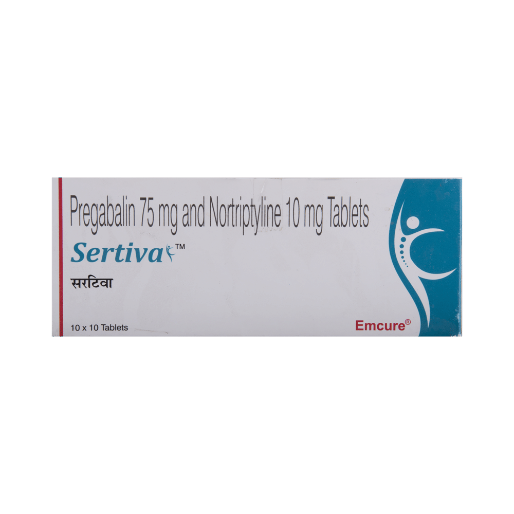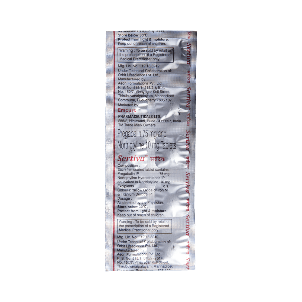 Sertiva Tablet is a combination of two medicines: Pregabalin and Nortriptyline. Pregabalin is an alpha-2 delta ligand that decreases pain by modulating the calcium channel activity of the nerve cells. Nortriptyline is a tricyclic antidepressant that increases the levels of chemical messengers (serotonin and noradrenaline) that stop the movement of pain signals in the brain. Together, they relieve neuropathic pain (pain from damaged nerves).