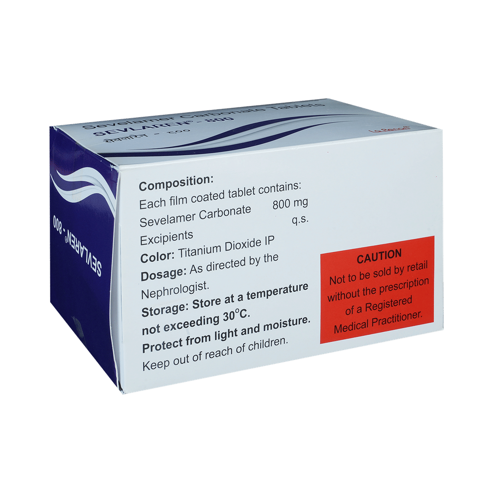 Sevlaren 800 Tablet is used to treat increased phosphate levels in the blood. It is used in patients who are on dialysis due to severe kidney disease. It inhibits the absorption of phosphate from the intestine and lowers the phosphate levels in the blood. Sevlaren 800 Tablet should be taken with food. Take it in the dose and duration as advised by your doctor. Take it regularly and at a fixed time each day to get the maximum benefit of the medicine.Sevlaren 800 Tablet may cause side effects such as nausea, vomiting, abdominal pain, constipation, and diarrhea. You may also develop low levels of calcium, folic acid, and vitamins A, D, E, and K in your blood. Take necessary supplements as advised by your doctor.