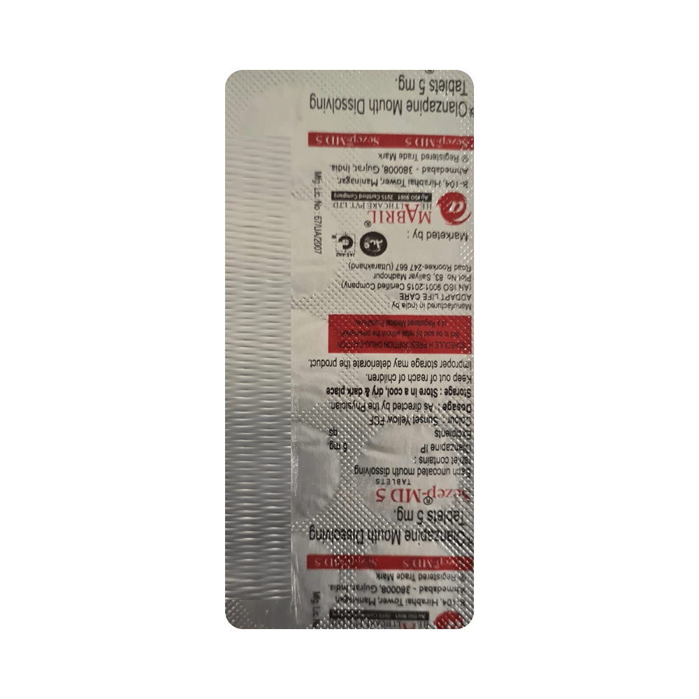 Sezep-MD 5 Tablet is used in the treatment of schizophrenia (a mental disorder that can result in hallucinations or delusions and also adversely affects a person’s ability to think and behave) and mania. Sezep-MD 5 Tablet may be taken with or without food. However, it is advised to take it at the same time each day as this helps to maintain a consistent level of medicine in the body. Take this medicine in the dose and duration as advised by your doctor and if you have missed a dose, take it as soon as you remember. This medication mustn't be stopped suddenly without talking to your doctor as it may worsen your symptoms.Some common side effects of this medicine include dryness in the mouth, constipation, muscle rigidity, and restlessness. Initially, this medicine may cause a sudden drop in blood pressure when you change positions, so it is better to rise slowly if you have been sitting or lying down. It also causes dizziness and sleepiness, so do not drive or do anything that requires mental focus until you know how this medicine affects you.However, this medicine may increase your weight, blood sugar, and cholesterol levels but, modifying your lifestyle by having a healthy diet and exercising regularly can reduce this side effect. You should be cautious as in rare cases it may cause serious side effects like very high blood sugar levels or seizures.