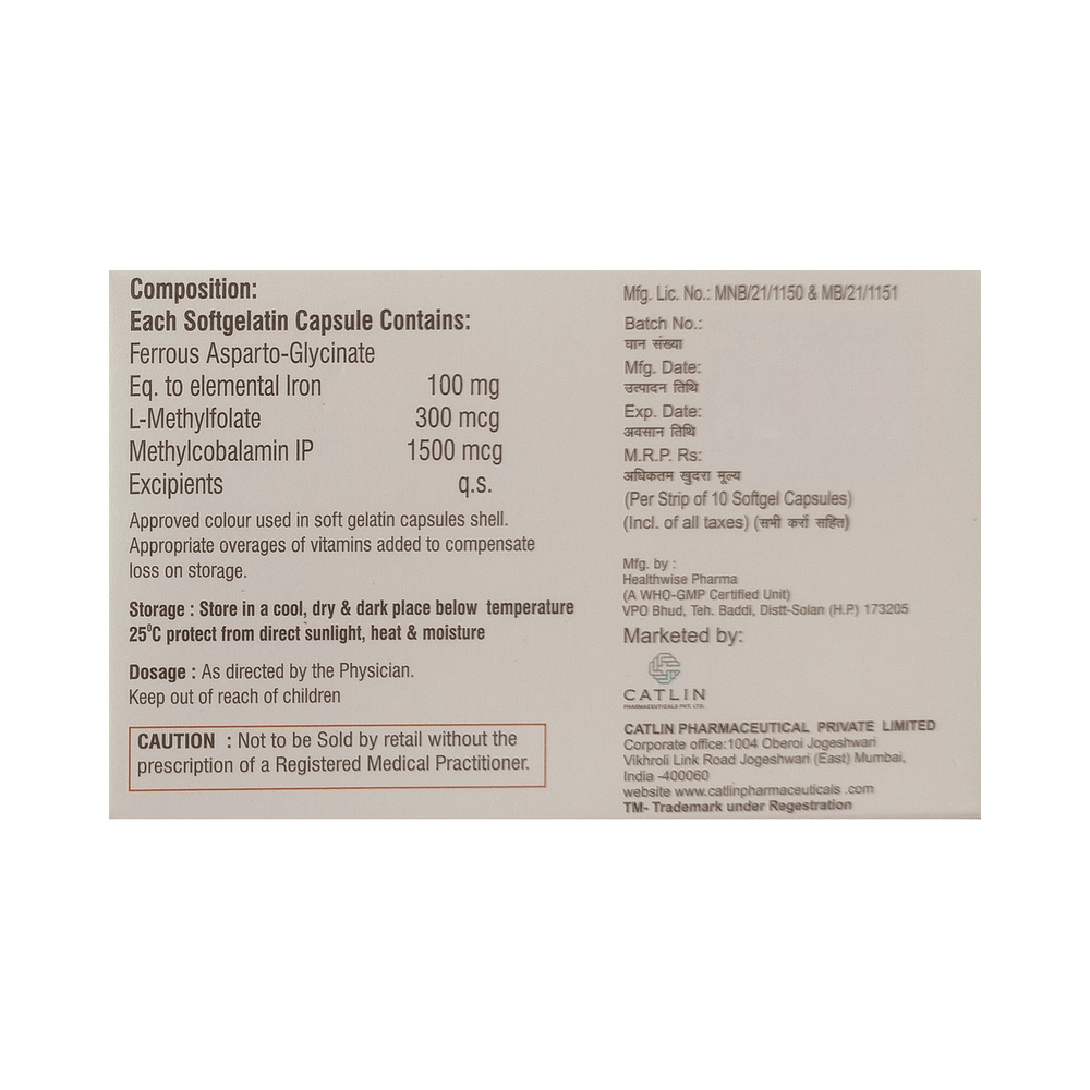 Salt Composition: L-Methyl Folate (300mcg) + Methylcobalamin (1500mcg) + Iron (100mg)