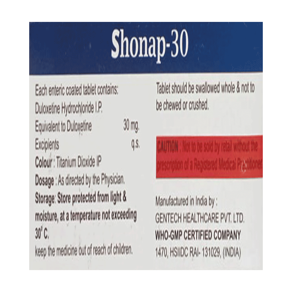 Shonap 30 Tablet is used in the treatment of depression, anxiety disorder, diabetic nerve pain, fibromyalgia (a condition in which there are generalized pain and tenderness in the body), neuropathic pain, and stress urinary incontinence. Shonap 30 Tablet works by increasing the level of chemical messengers (serotonin and noradrenaline) in the brain that have a calming effect on the brain and relax the nerves, thus treating your illness. It may be taken with or without food. It is advised to take this medicine at a fixed time each day to maintain a consistent level in the blood. If you miss any doses, take it as soon as you remember. Do not skip any doses and finish the full course of treatment even if you feel better. This medication mustn't be stopped suddenly as it may worsen your symptoms.Some common side effects of this medicine include nausea, headache, decreased libido, abnormal dreams, blurred vision, and dry mouth. It even causes dizziness and sleepiness, so do not drive or do anything that requires mental focus until you know how this medicine affects you. However, these side effects are temporary and usually resolve on their own in some time. Please consult your doctor if these do not subside or bother you.Before taking Shonap 30 Tablet, inform your doctor if you have any problems with your kidneys, heart, liver, or have a history of seizures (epilepsy or fits). Inform your doctor if you develop any unusual changes in mood or behavior, new or worsening depression, or if you have any suicidal thoughts.