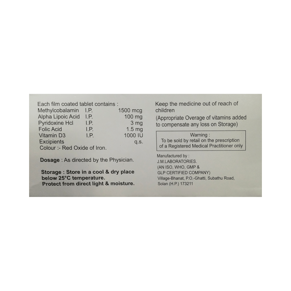 Salt Composition: Methylcobalamin (1500mcg) + Alpha Lipoic Acid (100mg) + Vitamin B6 (Pyridoxine) (3mg) + Folic Acid (1.5mg) + Vitamin D3 (1000IU)