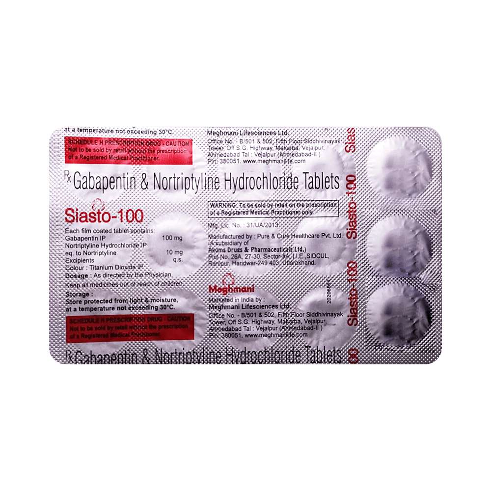 Siasto 100 Tablet is a combination medicine used for the treatment of neuropathic pain. This medicine decreases the pain by stopping the movement of pain signals to the brain. Siasto 100 Tablet is taken by mouth, with or without food and preferably at night. It is advised to take it at a fixed time each day to maintain a consistent level of medicine in the blood. In case you miss a dose of this medicine, take it as soon as you remember. Finish the full course of treatment even if you feel better. It is important not to stop taking this medicine suddenly without talking to the doctor as it may worsen your symptoms.Some common side effects of this medicine constipation, difficulty in urination, weight gain, tiredness, and dryness in mouth. It may also cause dizziness and sleepiness, so do not drive or do anything that requires mental focus until you know how this medicine affects you. This medicine may cause weight gain and to control it, you should exercise regularly and take a balanced diet. Remember to inform the doctor if you develop any unusual changes in mood as this medicine may lead to suicidal thoughts.Before taking this medicine let your doctor know if you suffer from kidney or liver disease. Your doctor should also know about all other medicines you are taking as many of these may make this medicine less effective or change the way it works. Inform your doctor if you are pregnant, planning pregnancy or breastfeeding.