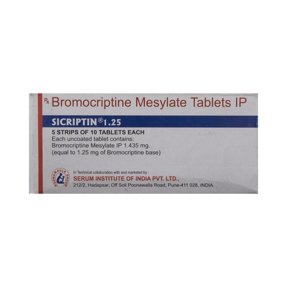In Female infertilitySicriptin 1.25 Tablet helps in the regulation of ovulation and menstruation. It is used to cause menstrual periods in women who have not reached menopause but are not having periods due to too much prolactin hormone in the body. Use the medicine as prescribed for it to be effective.In AcromegalyAcromegaly is a hormonal disorder that occurs due to excessive secretion of growth hormone in adults. When this happens, the bones increase in size, including those of your hands, feet, and face. Sicriptin 1.25 Tablet helps decrease the growth hormone levels, and therefore, helps in treating acromegaly and its associated effects. Take it as advised by the doctor to get the most benefits.In High levels of prolactinProlactin is a hormone that helps in the growth and development of breasts and also causes milk secretion in females. Sicriptin 1.25 Tablet helps to stop breast milk secretion in females that have had a still birth, miscarriage or abortion. It acts on a chemical in the brain, dopamine, that is responsible for these high levels of prolactin and stops milk secretion.show moreshow less