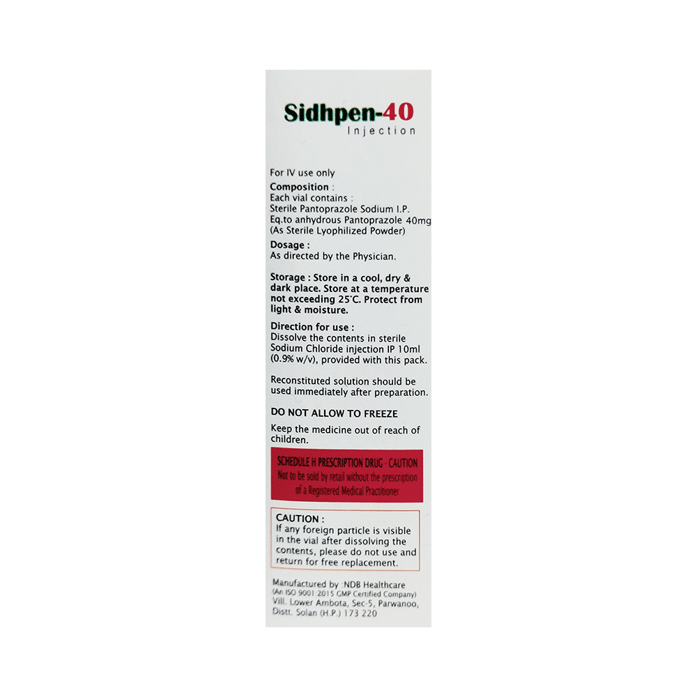 Sidhpen 40 Injection is a medicine that reduces the amount of acid produced in your stomach. It is used for treating acid-related diseases of the stomach and intestine such as acid reflux, peptic ulcer disease, Zollinger-Ellison syndrome. It provides relief from symptoms and promotes healing. Sidhpen 40 Injection is also used to prevent stress ulcers in seriously ill patients and is administered before anesthetic medication to help prevent aspiration-related complications. It belongs to a class of medicines known as proton pump inhibitors (PPIs). This medicine is administered into a vein by a healthcare professional and will only be given to you if your doctor thinks that an injection is more suitable for you at the moment than a tablet. The dose will depend on your underlying condition and how you respond to the medicine. Your doctor will decide the duration of treatment but you should keep on taking it as prescribed, even if your symptoms disappear quickly. You can increase the efficiency of the treatment by eating smaller meals more often and avoiding caffeinated drinks (like tea and coffee), and spicy or fatty foods.The most common side effects observed with this medicine include nausea, vomiting, headache, dizziness, flatulence, diarrhea, stomach pain, and thrombophlebitis (pain, redness, and swelling of the vein). These symptoms are generally mild but if they bother you or do not go away, consult your doctor. Long-term use of this medicine may lead to an increased risk of side effects. For instance, using this medicine for more than 1 year may increase your risk for bone fractures, especially with higher doses. Talk to your doctor about ways to prevent bone loss (osteoporosis), like taking calcium and vitamin D supplements.Sidhpen 40 Injection is not suitable for some people. Before taking this medicine, you need to tell your doctor if you have severe liver problems, are taking medicines for HIV, have ever had an allergic reaction to similar medicines in the past, or suffer from bone loss (osteoporosis). Pregnant or breastfeeding women should also consult their doctor before taking it. Avoid drinking alcohol as it makes your stomach produce excessive acid and can worsen your symptoms. Do not drive or use machinery or tools, if this medicine makes you feel dizzy or sleepy.