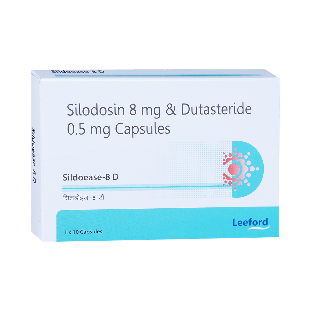 In Treatment of Benign prostatic hyperplasiaWhen your prostate gland becomes enlarged it can cause urinary problems such as difficulty passing urine and a need to go to the toilet frequently or urgently. It can also cause urine flow to be slower. If not treated, there is a risk that your urine flow will be completely blocked. Sildoease-8D Capsule is a combination of two medicines that reduces the size of your prostate by blocking the production of a hormone which causes it to grow. Additionally, it relaxes the muscles in the bladder and prostate. Together they can rapidly relieve the symptoms and make it easier for you to urinate. However, it may take up to 6 months to notice the full benefits. Take this medicine exactly as prescribed for maximum benefits.
