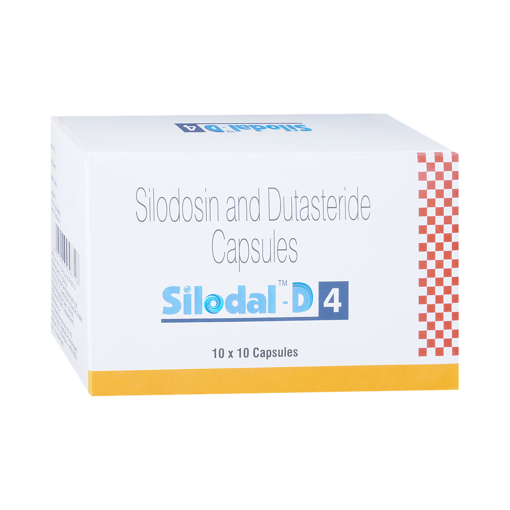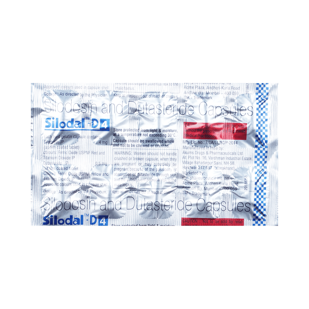 In Treatment of Benign prostatic hyperplasiaWhen your prostate gland becomes enlarged it can cause urinary problems such as difficulty passing urine and a need to go to the toilet frequently or urgently. It can also cause urine flow to be slower. If not treated, there is a risk that your urine flow will be completely blocked. Silodal-D4 Capsule is a combination of two medicines that reduces the size of your prostate by blocking the production of a hormone which causes it to grow. Additionally, it relaxes the muscles in the bladder and prostate. Together they can rapidly relieve the symptoms and make it easier for you to urinate. However, it may take up to 6 months to notice the full benefits. Take this medicine exactly as prescribed for maximum benefits.