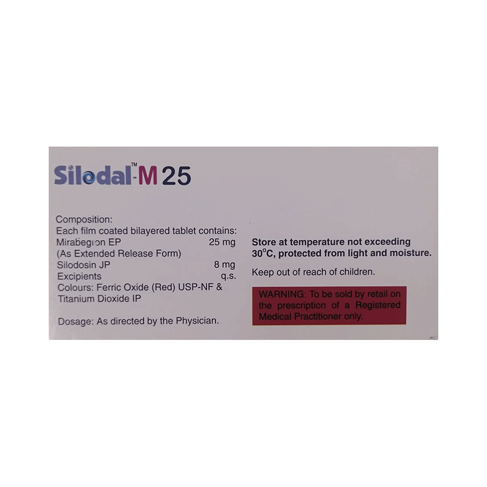 Silodal-M 25 Tablet ER is a combination medicine that is used in the treatment of benign prostatic hyperplasia. It helps to relieve symptoms like difficulty in passing urine. However, it does not decrease the size of the prostate. Silodal-M 25 Tablet ER is advised to take it in a dose and duration as per prescription. It may be taken with or without food. Take it regularly at the same time each day. Swallow the medicine as a whole without crushing or chewing it. You should not stop taking the medicine without consulting the doctor as it may lead to the worsening of your symptoms. The course of the treatment should be completed for better efficacy of the medicine.Some common side effects of this medicine are retrograde ejaculation, dizziness, diarrhea, orthostatic hypotension, headache, nasopharyngitis, and nasal congestion. If any of the side effects persist or bother you, you must consult the doctor without delay.Simple lifestyle changes can help you manage your symptoms better. Try to urinate as soon as you feel the urge, however, never strain or push to empty your bladder. You should avoid drinking caffeinated or alcoholic drinks at night and a few hours before going to bed or going out.Before receiving the treatment, inform your doctor if you are on any medication for any other health condition. If you have to undergo eye surgery due to cataracts or glaucoma then inform your eye doctor about the usage of this medicine. Patients with liver or kidney disease must be cautious while receiving the prescription, and they must receive regular follow-ups as per the doctor’s advice.