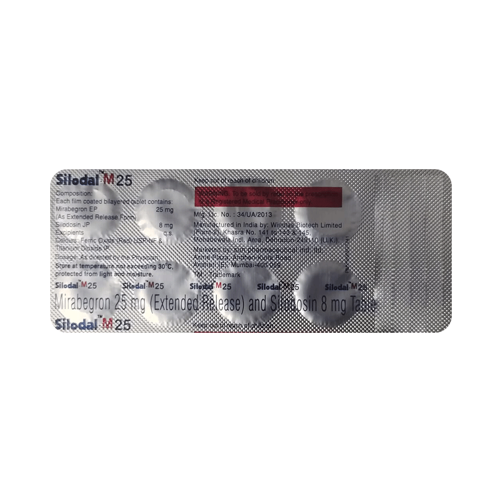 In Benign prostatic hyperplasiaWhen your prostate gland becomes enlarged it can cause urinary problems such as difficulty passing urine and the need to go to the toilet frequently or urgently. It can also cause urine flow to be slower. If not treated, there is a risk that your urine flow will be completely blocked. Silodal-M 25 Tablet ER works by relaxing muscles in the bladder and prostate. So, it can rapidly relieve the symptoms and make it easier for you to urinate. It also helps to treat uncontrollable contractions (spasms) of the bladder muscles that cause frequent urination, urgent need to urinate, and inability to control passing of urine. It also relieves painful, or frequent urination and reduces urgency to urinate. Take this medicine exactly as prescribed for maximum benefits.