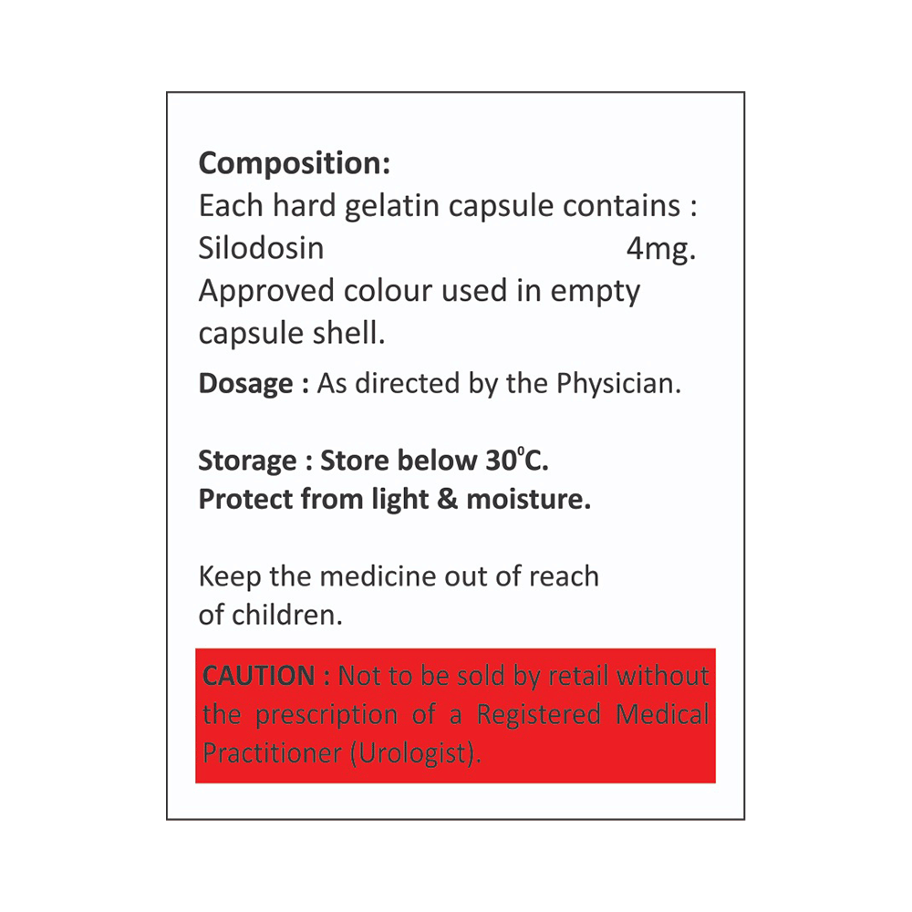 Silodom 4 Capsule is an alpha-adrenergic antagonist that is used in the treatment of benign prostatic hyperplasia. It helps to relieve symptoms like difficulty in passing urine. However, it does not decrease the size of the prostate. Silodom 4 Capsule is advised to take it in a dose and duration as per prescription. It should be taken with food, but take at the same time regularly. Swallow the medicine as a whole without crushing or chewing it. You should not stop taking the medicine without consulting the doctor as it may lead to the worsening of your symptoms. The course of the treatment should be completed for better efficacy of the medicine.Some common side effects of this medicine are retrograde ejaculation, dizziness, diarrhea, orthostatic hypotension, headache, nasopharyngitis, and nasal congestion. If any of the side effects persist or bother you, you must consult the doctor without delay.Simple lifestyle changes can help you manage your symptoms better. Try to urinate as soon as you feel the urge, however, never strain or push to empty your bladder. You should avoid drinking caffeinated or alcoholic drinks at night and a few hours before going to bed or going out.Before receiving the treatment, inform your doctor if you are on any medication for any other health condition. If you have to undergo eye surgery due to cataracts or glaucoma then inform your eye doctor about the usage of this medicine. Patients with liver or kidney disease must be cautious while receiving the prescription, and they must receive regular follow-ups as per the doctor’s advice.