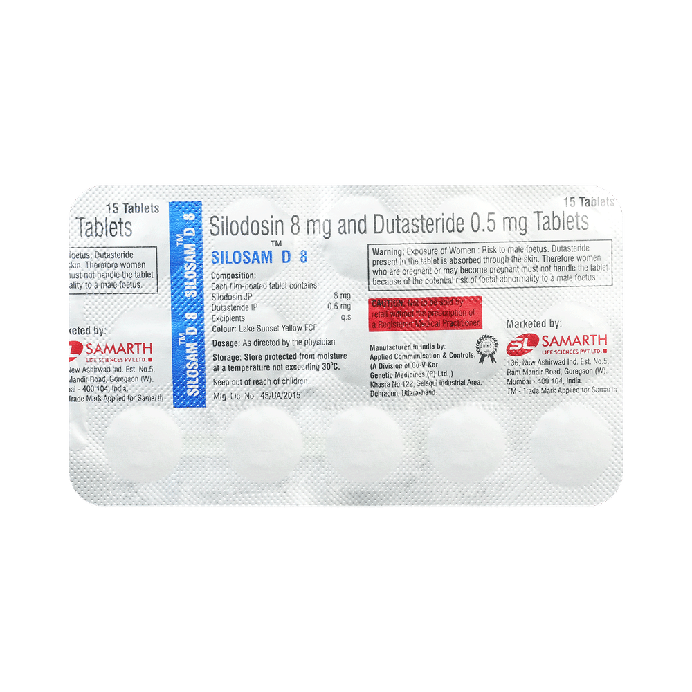 Silosam D 8 Tablet is a combination of two medicines that work in different ways to treat men with an enlarged prostate gland. It helps to relieve symptoms such as difficulty urinating or needing to go to the toilet more often. It is not used to prevent prostate cancer. Silosam D 8 Tablet should be taken at the same time each day. Take it as a whole, do not break, chew, or crush them. Your doctor will prescribe the dose most suitable for you. To gain the most benefit and treat your symptoms effectively you should not miss doses, even if you feel well. It may take up to 4 weeks to notice an improvement in symptoms but keep taking them regularly. Tell your doctor if your symptoms do not improve after 4 weeks or if they get worse.The most common side effects of this medicine include decreased libido, inability to get an erection (impotence), breast tenderness, and enlargement of your breasts. If these effects worry you or do not go away, call your doctor for advice. You may also feel dizzy or drowsy. These risks are higher when you first start taking this drug. Remember, your doctor has given you this medicine because the benefits are greater than the risks of the side effects.This medicine should not be taken by women or children. Before taking it, tell your doctor if you have low blood pressure or liver or kidney disease. This medicine may not be suitable. It can also affect, or be affected by, other drugs so let your doctor know all other medicines you are taking. You may be advised to wear a condom during sex and to have your blood pressure checked frequently. Talk to your healthcare team if you drink alcohol.